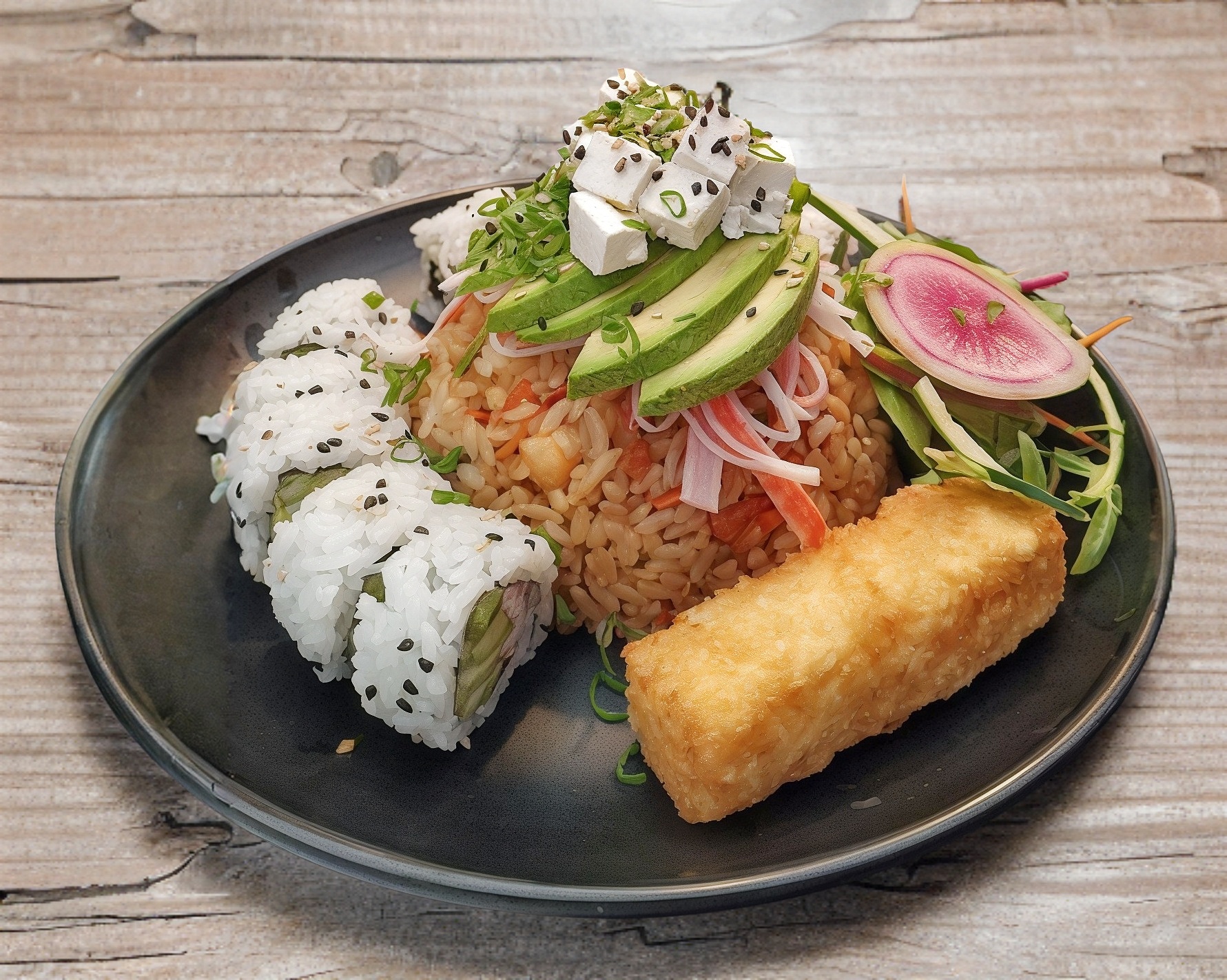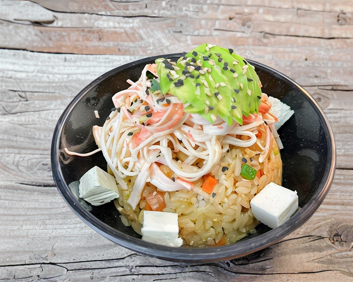 Arroz blanco, vegetales, camarón y pollo. Topping de cangrejo, aguacate y queso crema.