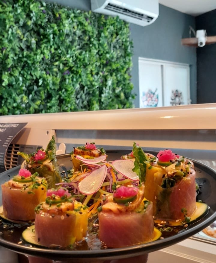 Envuelto en papel de arroz, pescado, lechuga, pepino, aguacate, cangrejo, camarón cocido y mango, rodaja de pulpo cocido y chile serrano. Acompañado de spicy, chiles toreados con soya y soya.