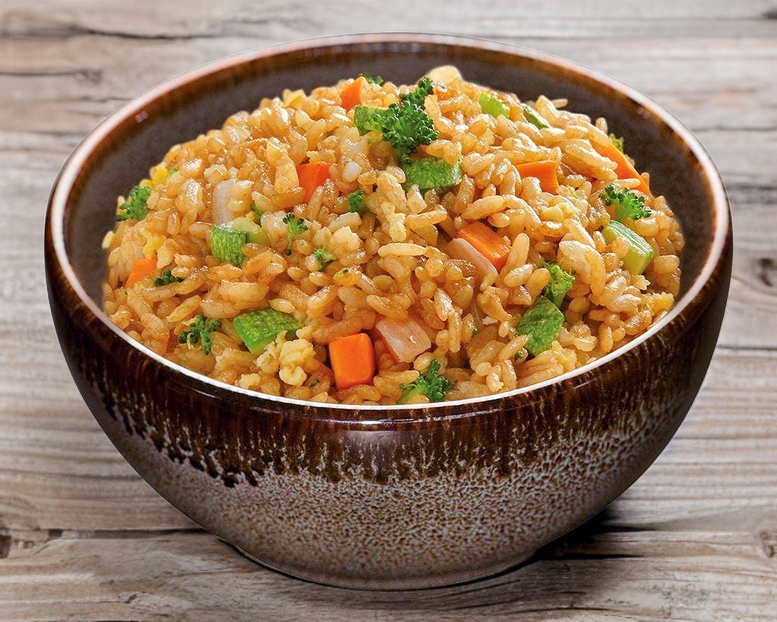 Arroz blanco, vegetales, camarón y pollo. Acompañado de spicy, chiles toreados con soya y soya.