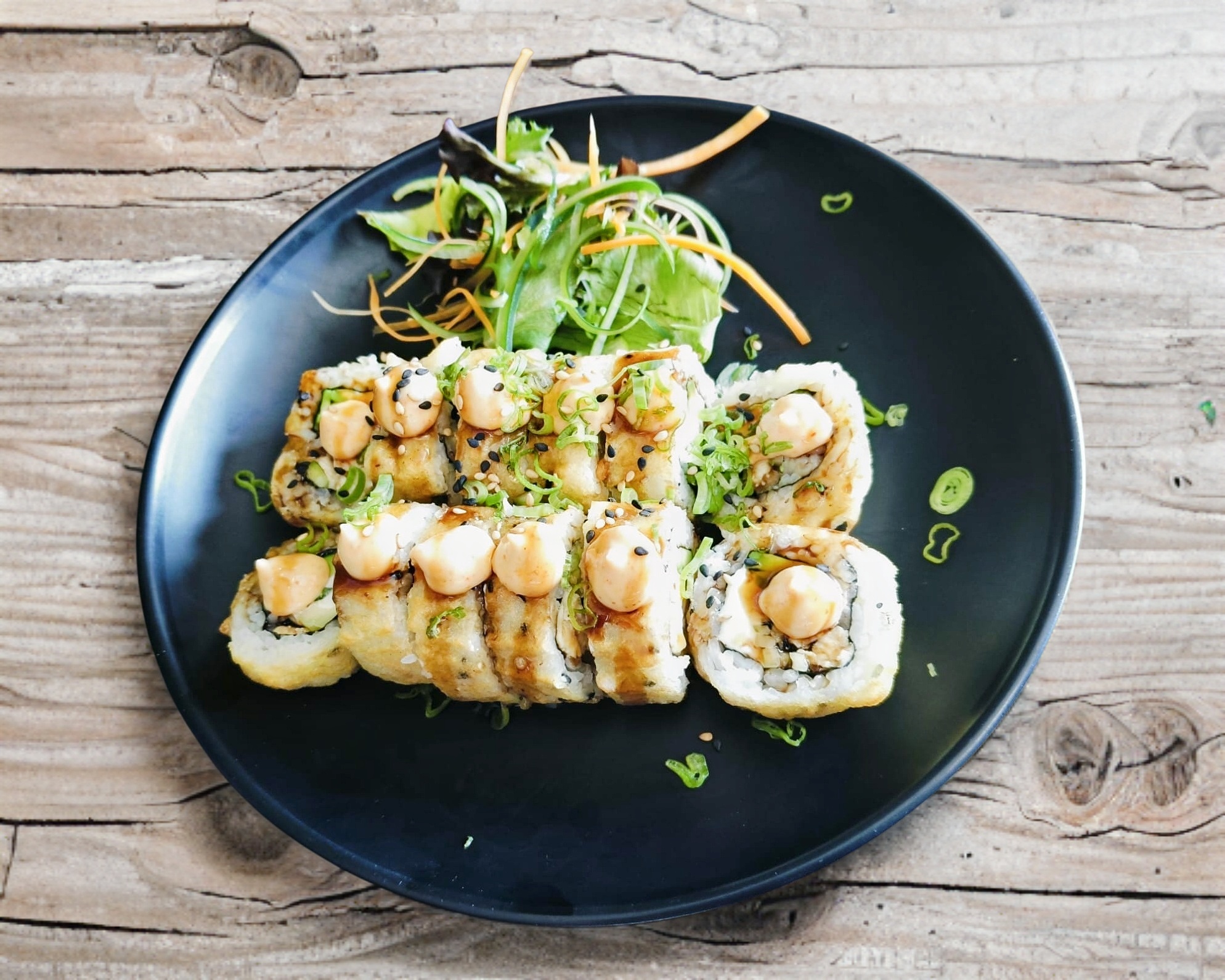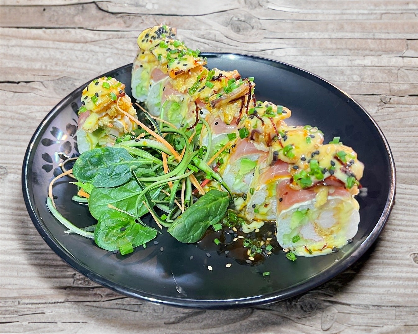 Aguacate, pepino, cangrejo, camarón tempura. Forrado pesca del día y topping camarón tempura, , salsa de cilantro y yuzu. Acompañado de spicy, chiles toreados con soya y soya.