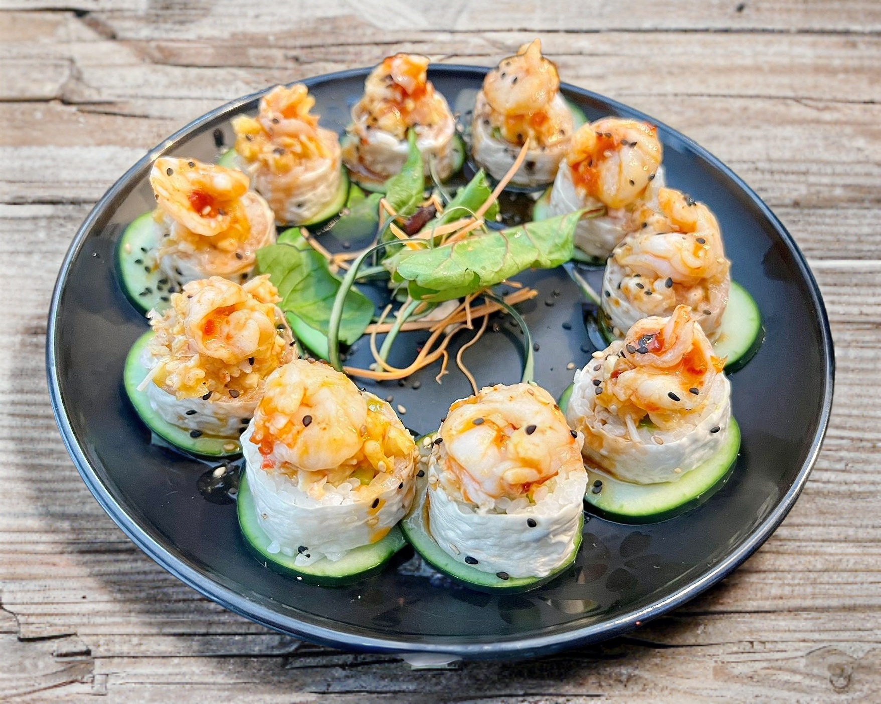 Aguacate, pepino, queso crema y camarón. Acompañado de spicy, chiles toreados con soya y soya.