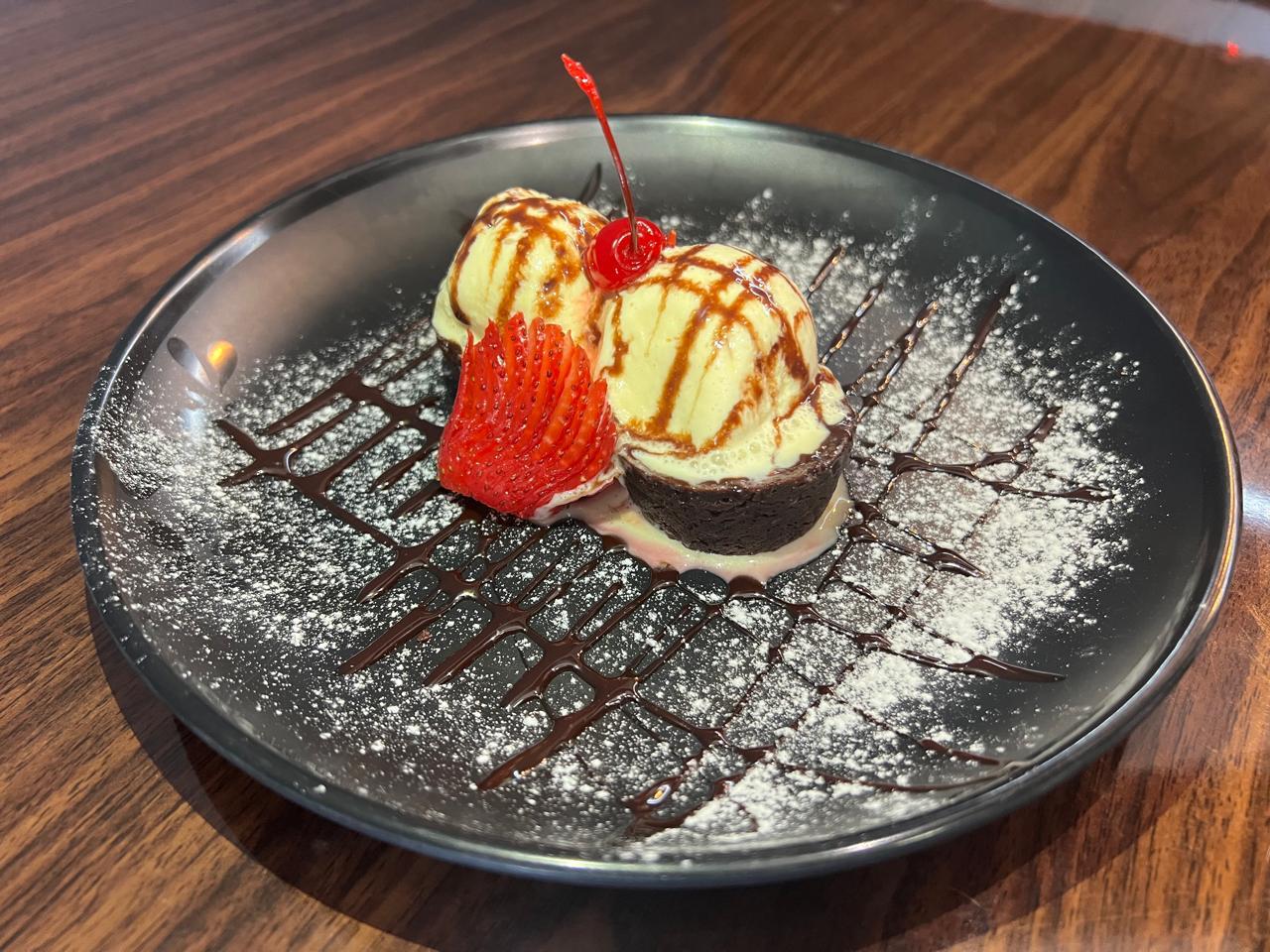 Forrado pesca del día, cangrejo spicy, aguacate por dentro, topping de camarón tempura y rebanada de fresa, ajo tostado y limón real. Acompañado de spicy, chiles toreados con soya y soya.