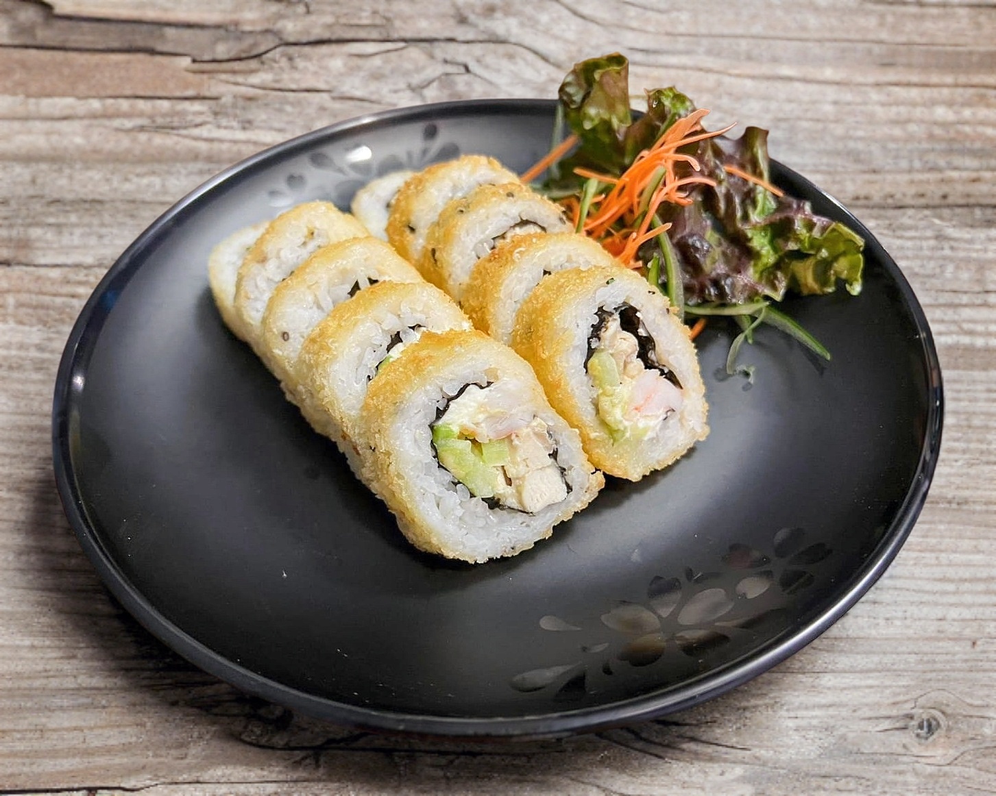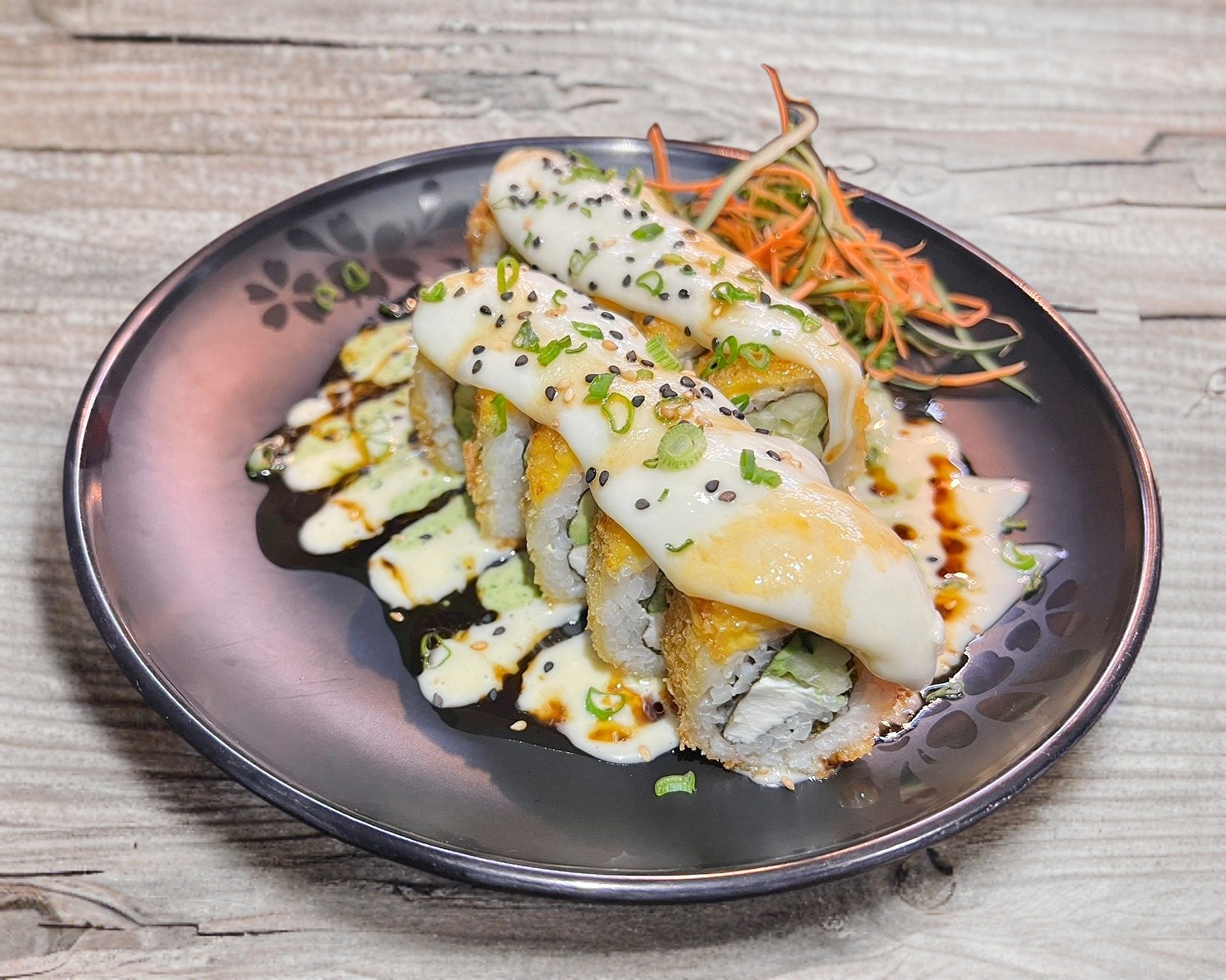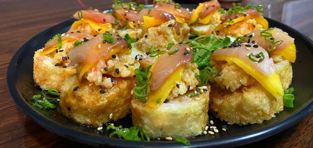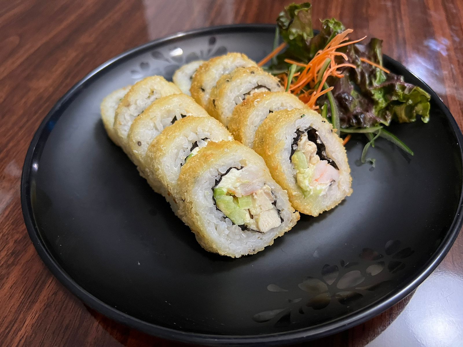Rollo empanizado con aguacate, pepino, queso crema, pollo y camarón. Acompañado de spicy, chiles toreados con soya y soya.