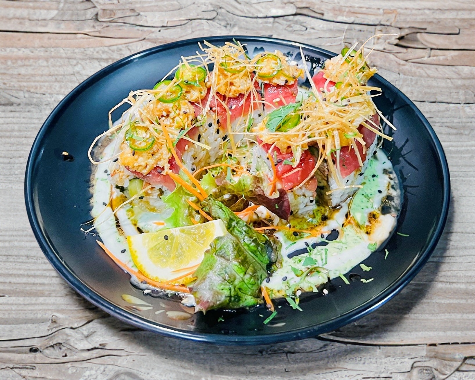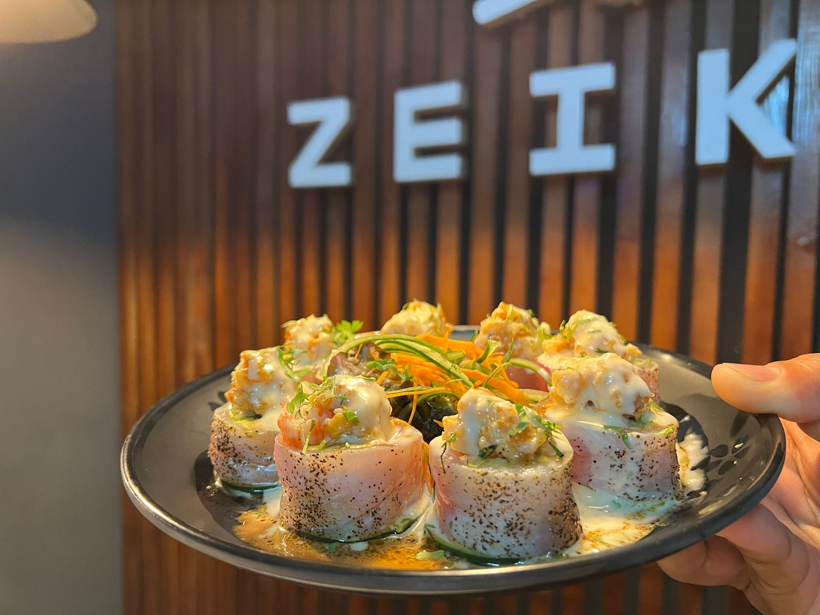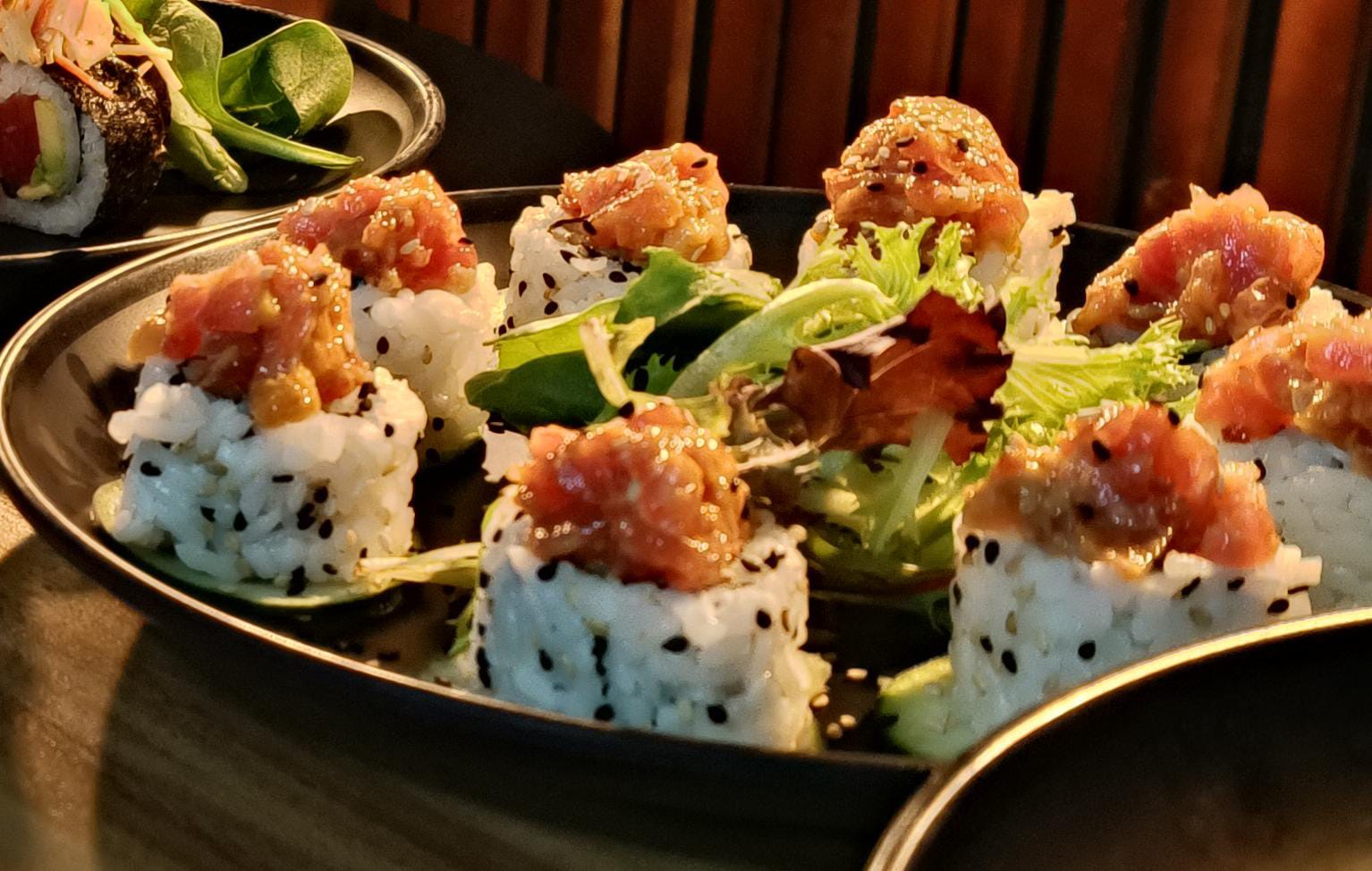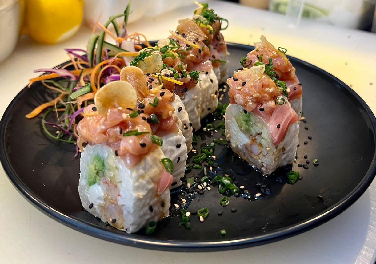 Aguacate, pepino, cangrejo spicy y camarón tempura. Forrado pesca del día, topping pescado spicy, ajo tostado y limón real.
