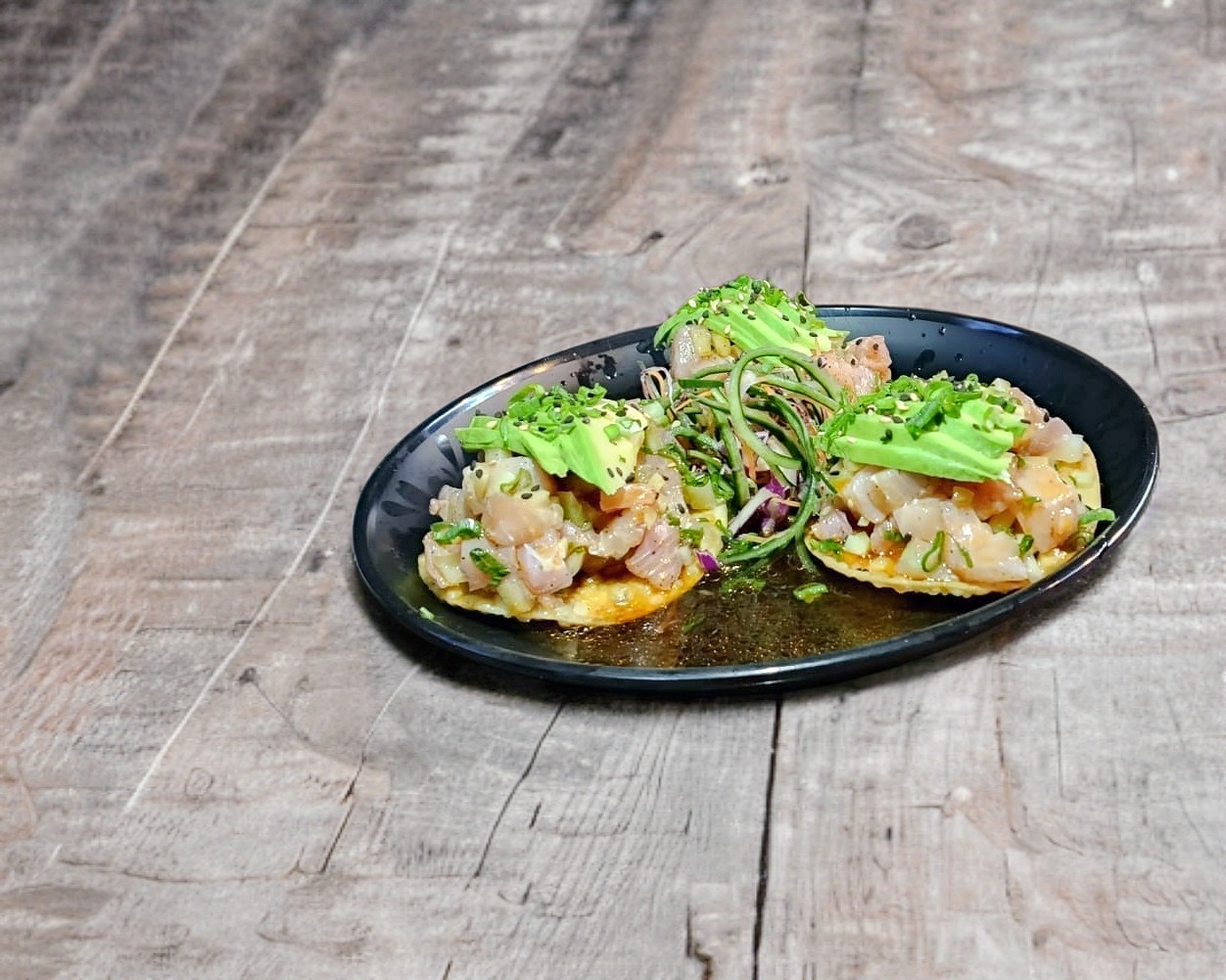 3 piezas de tostadas wonton con pescado, pepino, cilantro y aguacate.