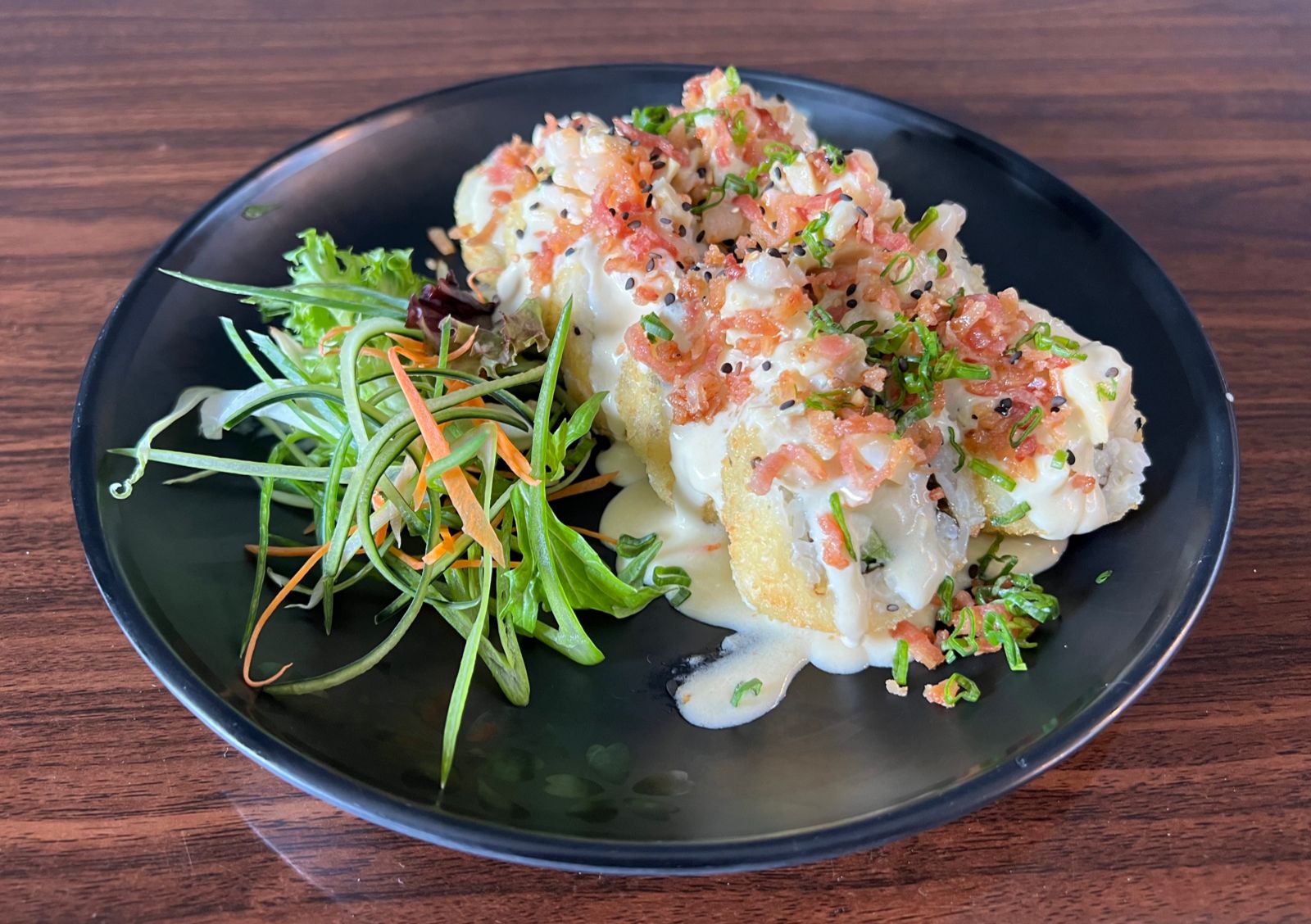 Aguacate, pepino, cangrejo, camarón, ajo tostado. Topping de cangrejo, pescado y camarón tempura con queso gratinado. Acompañado de spicy, chiles toreados con soya y soya.