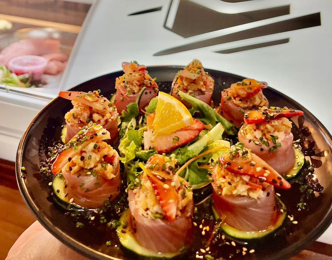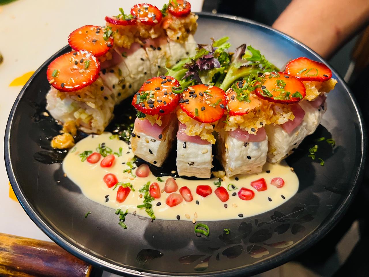Aguacate, pepino, cangrejo, camarón tempura y queso crema. Forrado de pesca del día, topping de camarón tempura y fresa. Acompañado de spicy, chiles toreados con soya y soya.