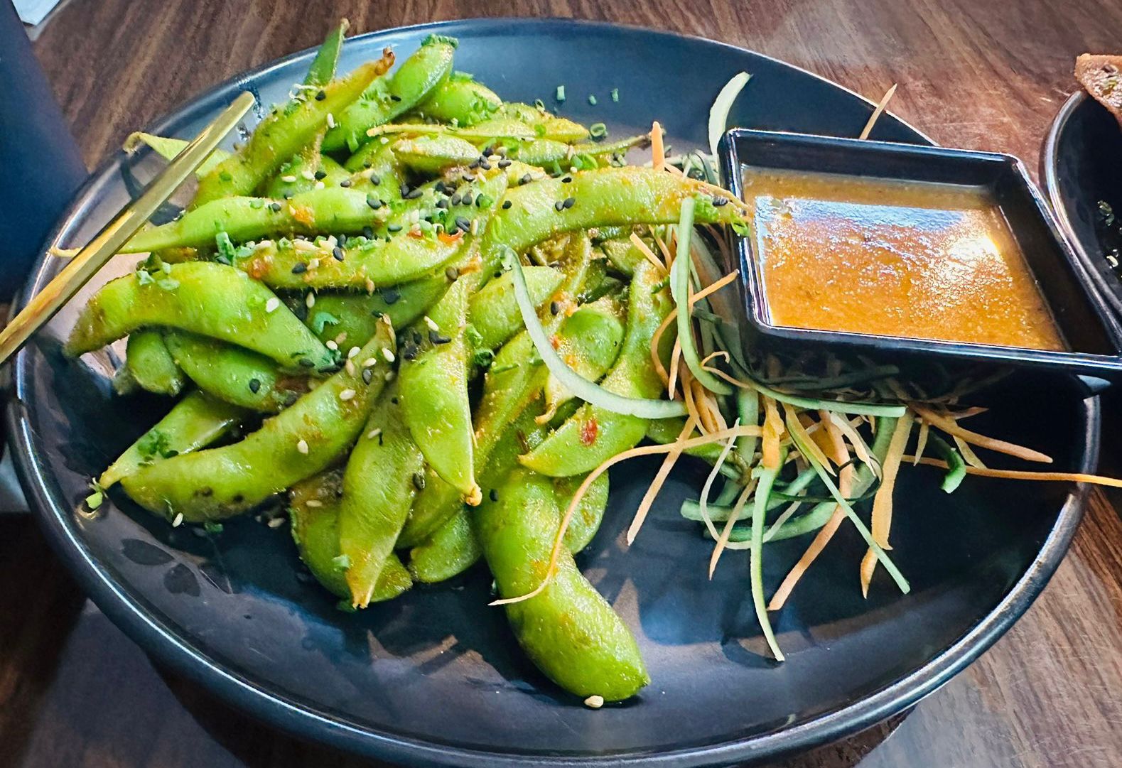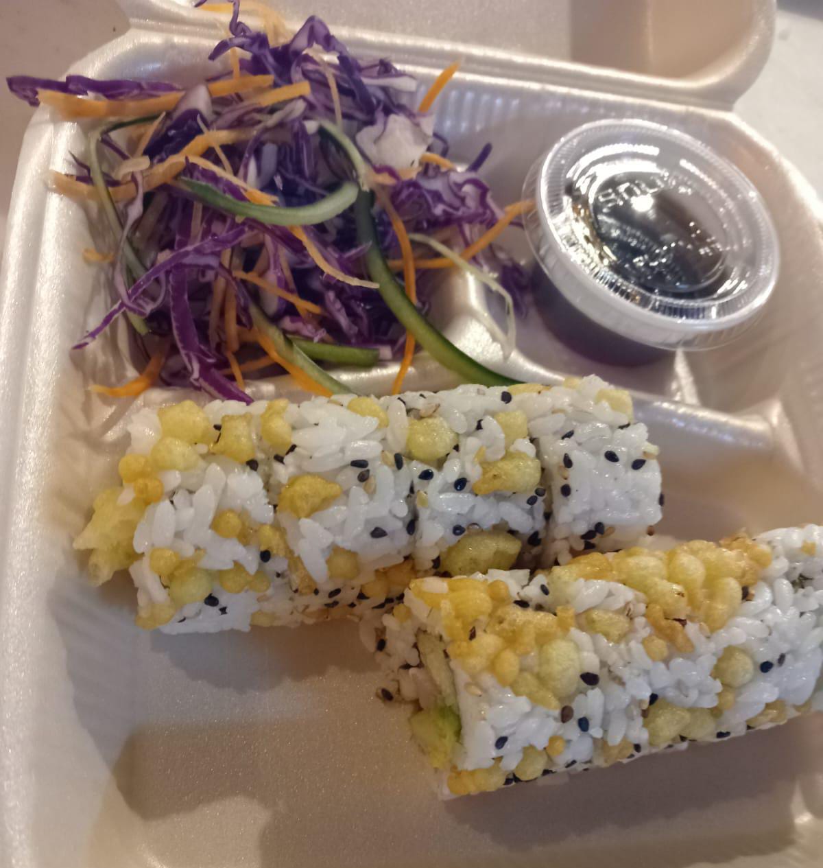 Rollo relleno de pepino, aguacate y cangrejo. Empanizado con panko. Acompañado de spicy, chiles toreados con soya y soya.