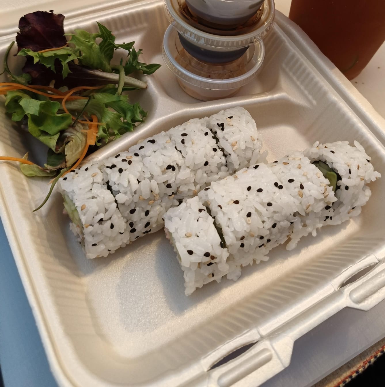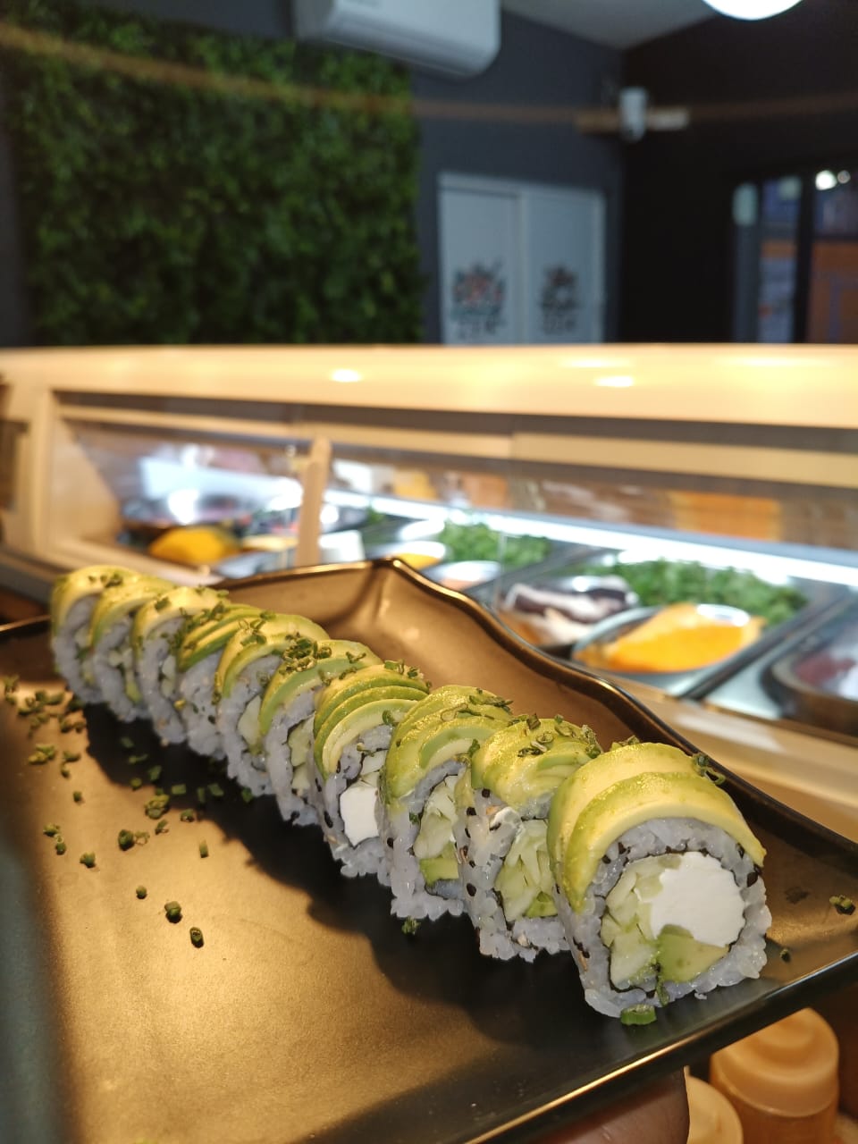 Aguacate, pepino, cangrejo y forrado en queso crema. Acompañado de spicy, chiles toreados con soya y soya.