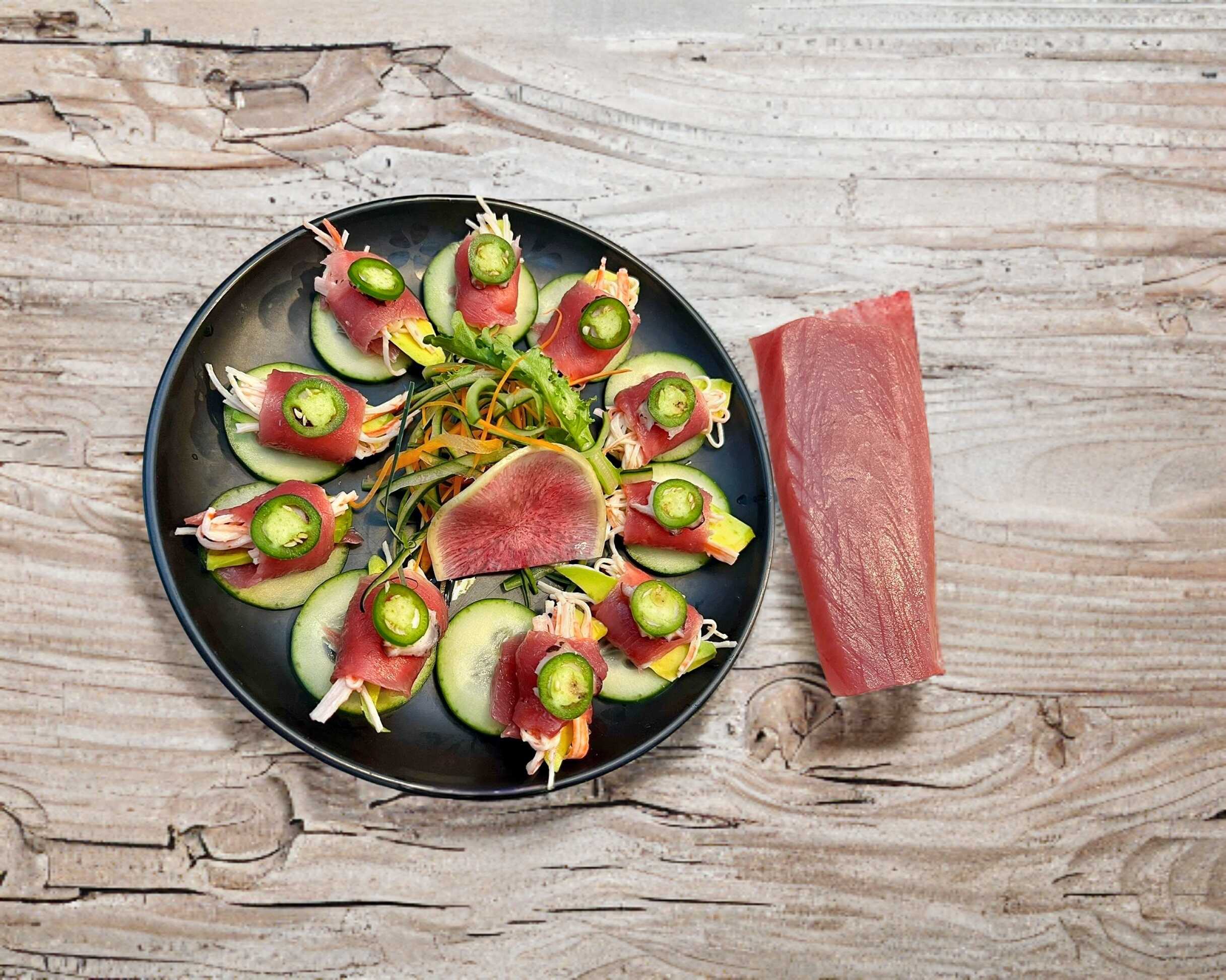 10 piezas de laminas de pescado rellenos de cangrejo con aguacate, serrano y pulpo.