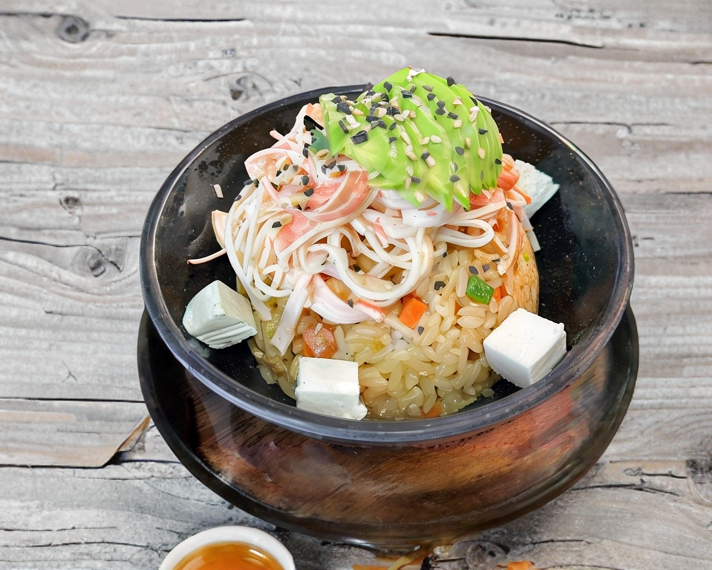 Arroz con vegetales, pollo y camaron. Topping de cangrejo, aguacate y queso crema. Acompañado de spicy, chiles toreados con soya y soya.