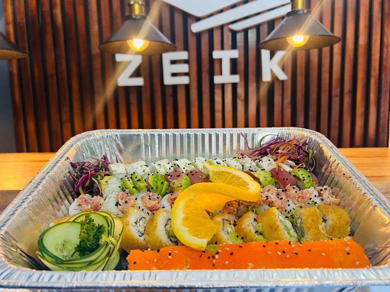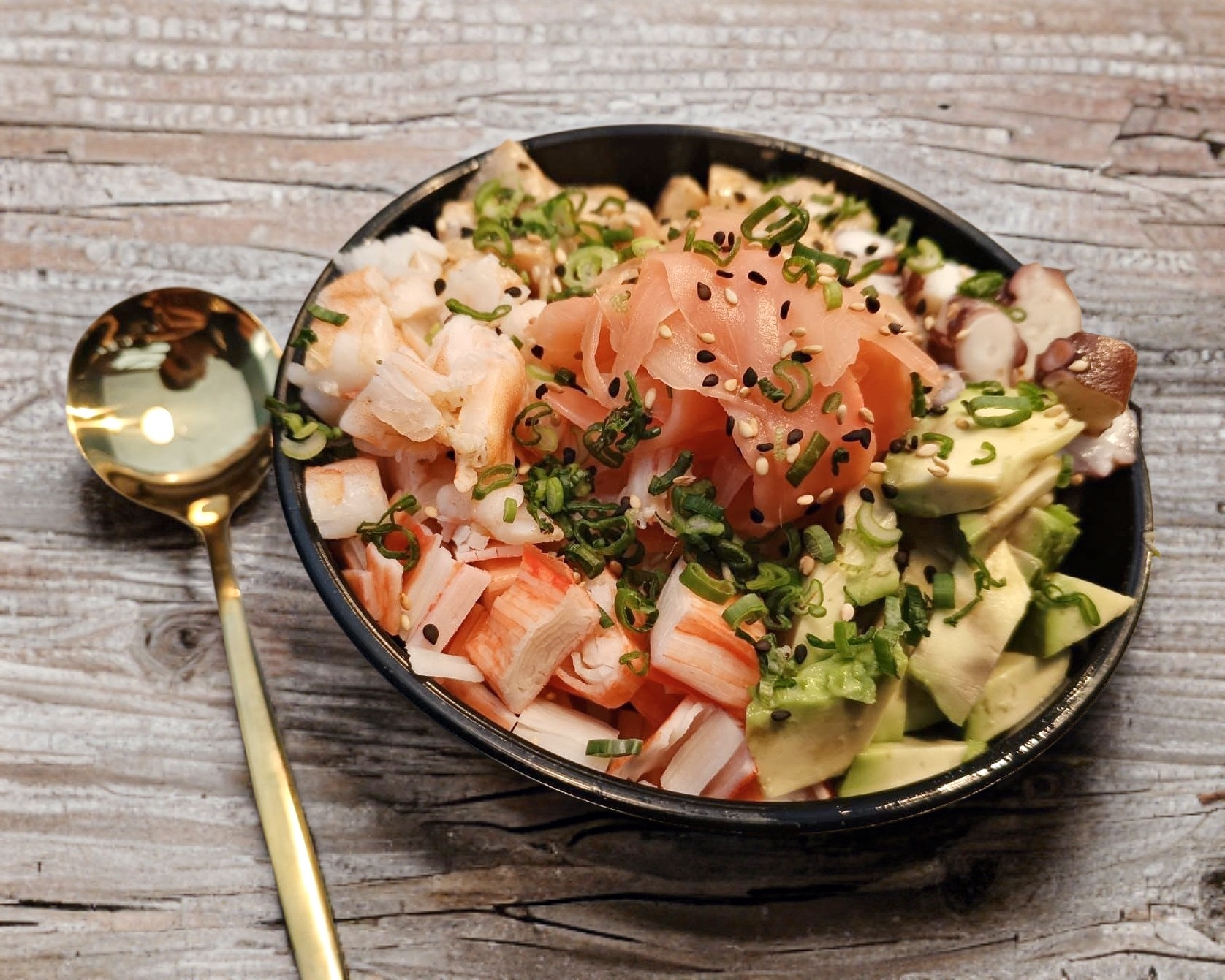 Arroz marinado con camaron cocido, kanikama, pescado spicy, pulpo, aguacate, pepino y jengibre.