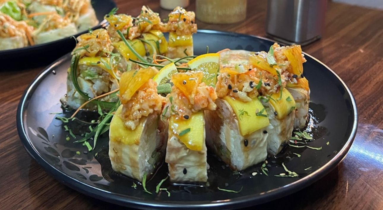 Aguacate, pepino, cangrejo, camarón tempura y queso crema. Forrado de mango, topping de camarón tempura y una rodaja de naranja. Bañado en salsa agridulce. Acompañado de spicy, chiles toreados con soya y soya.