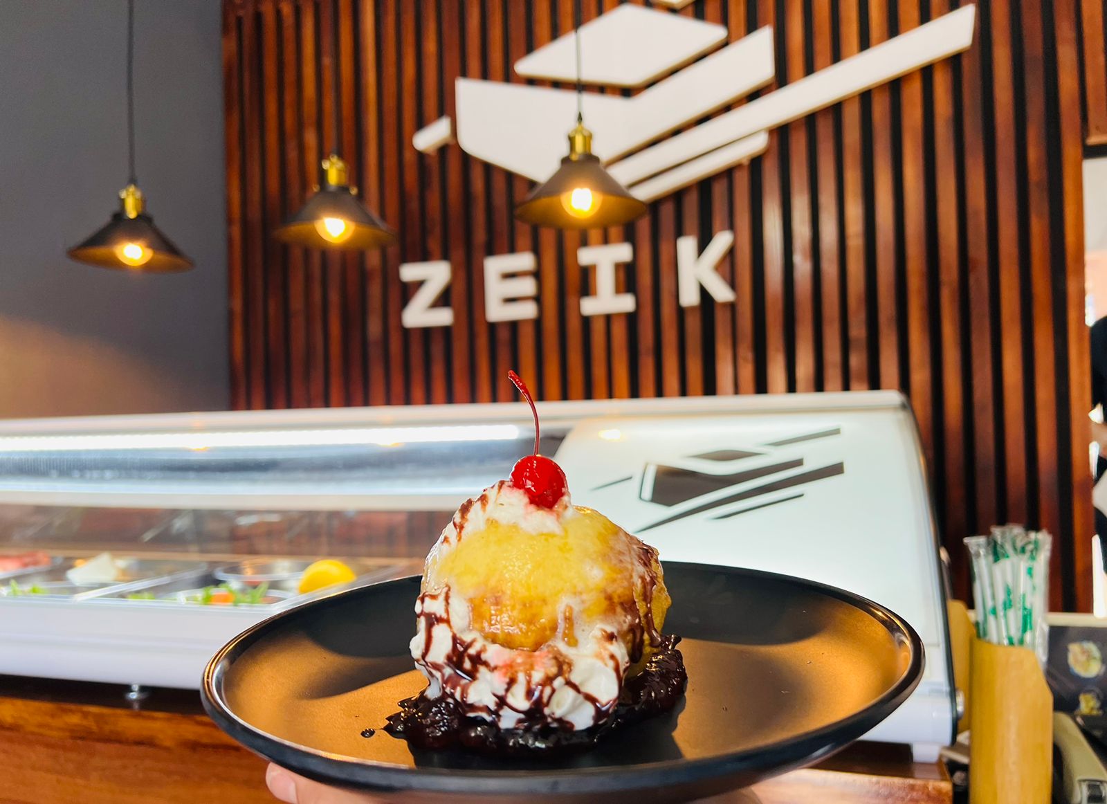 Queso crema, aguacate, pepino, camarón cocido y pollo. Por fuera queso amarillo y queso gratinado. Acompañado de spicy, chiles toreados con soya y soya.
