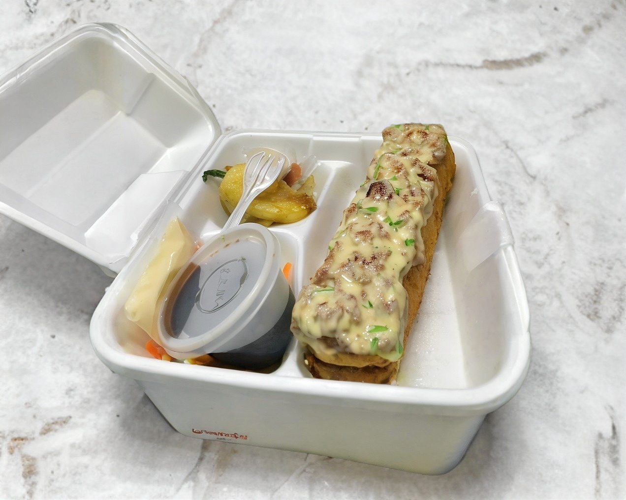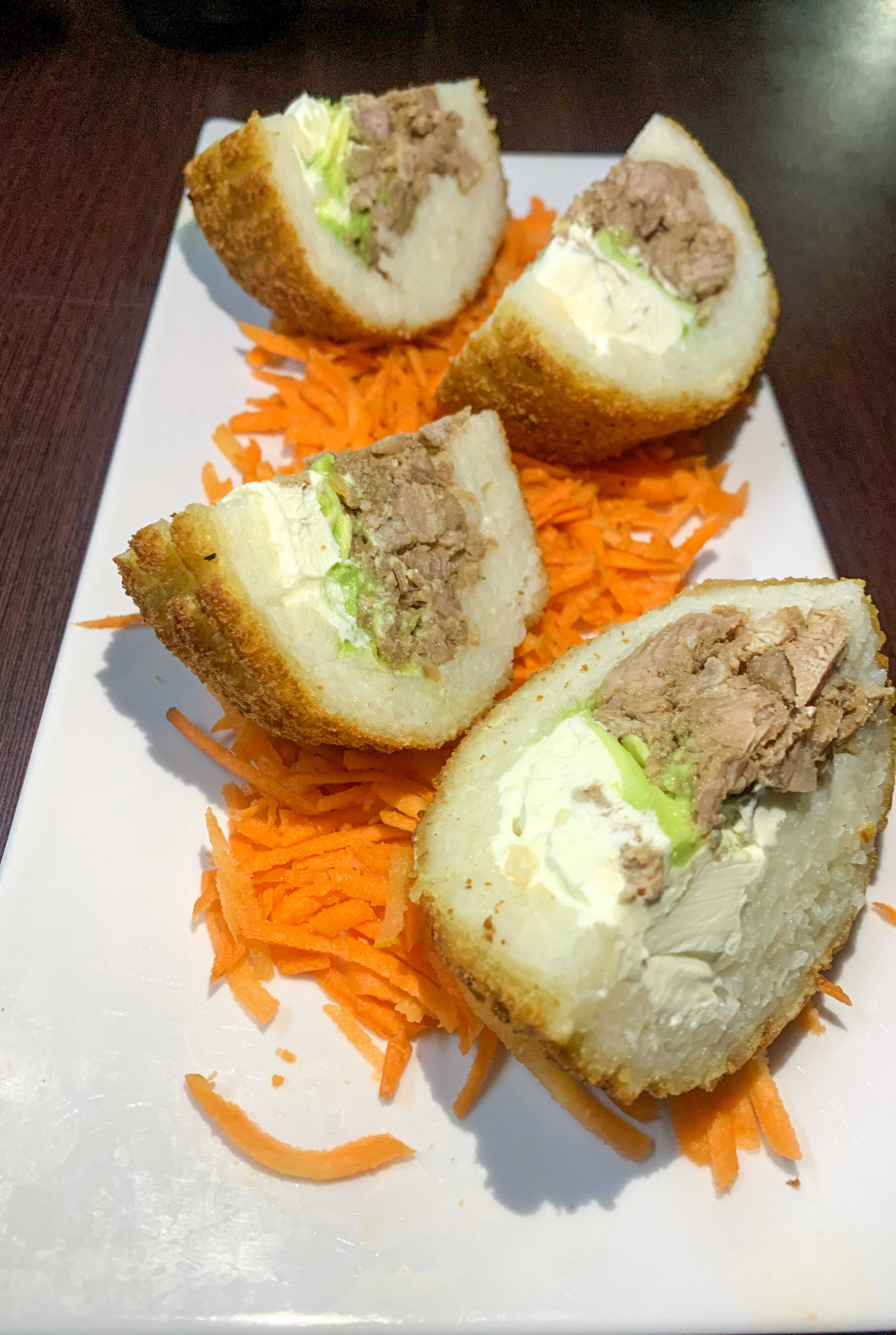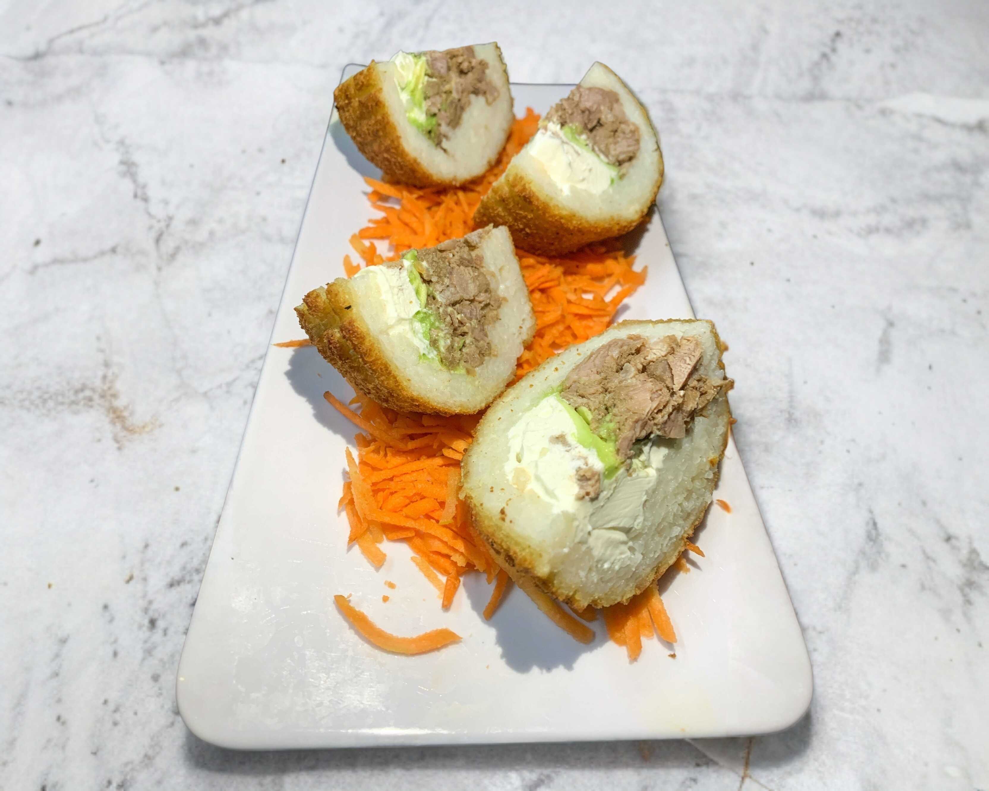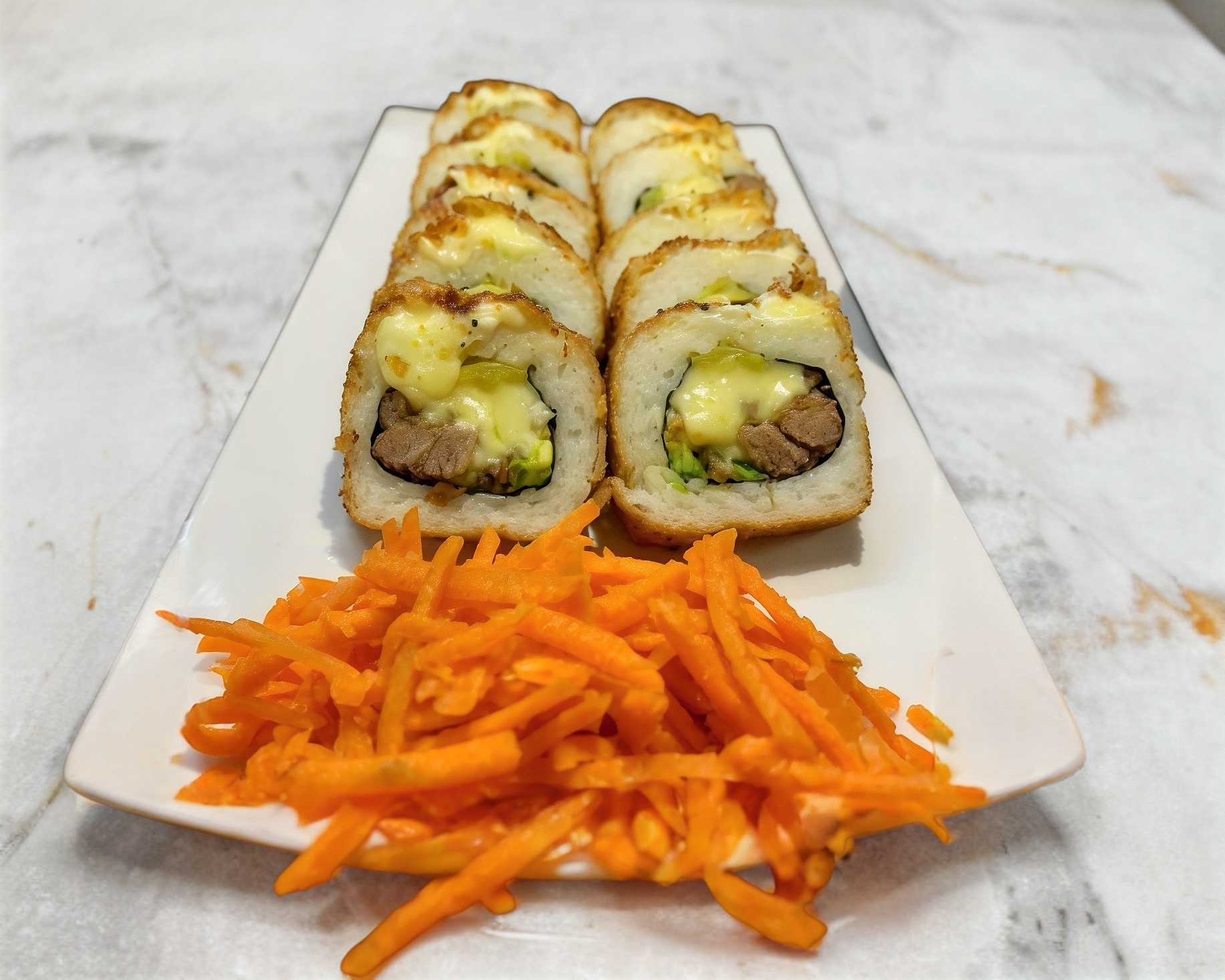 Rollo de res empanizada enchilada: relleno de aguacate, queso Philadelphia, queso Chihuahua y Caribe; cubierto por fuera con queso Philadelphia y manchego. Ideal para una sola persona.