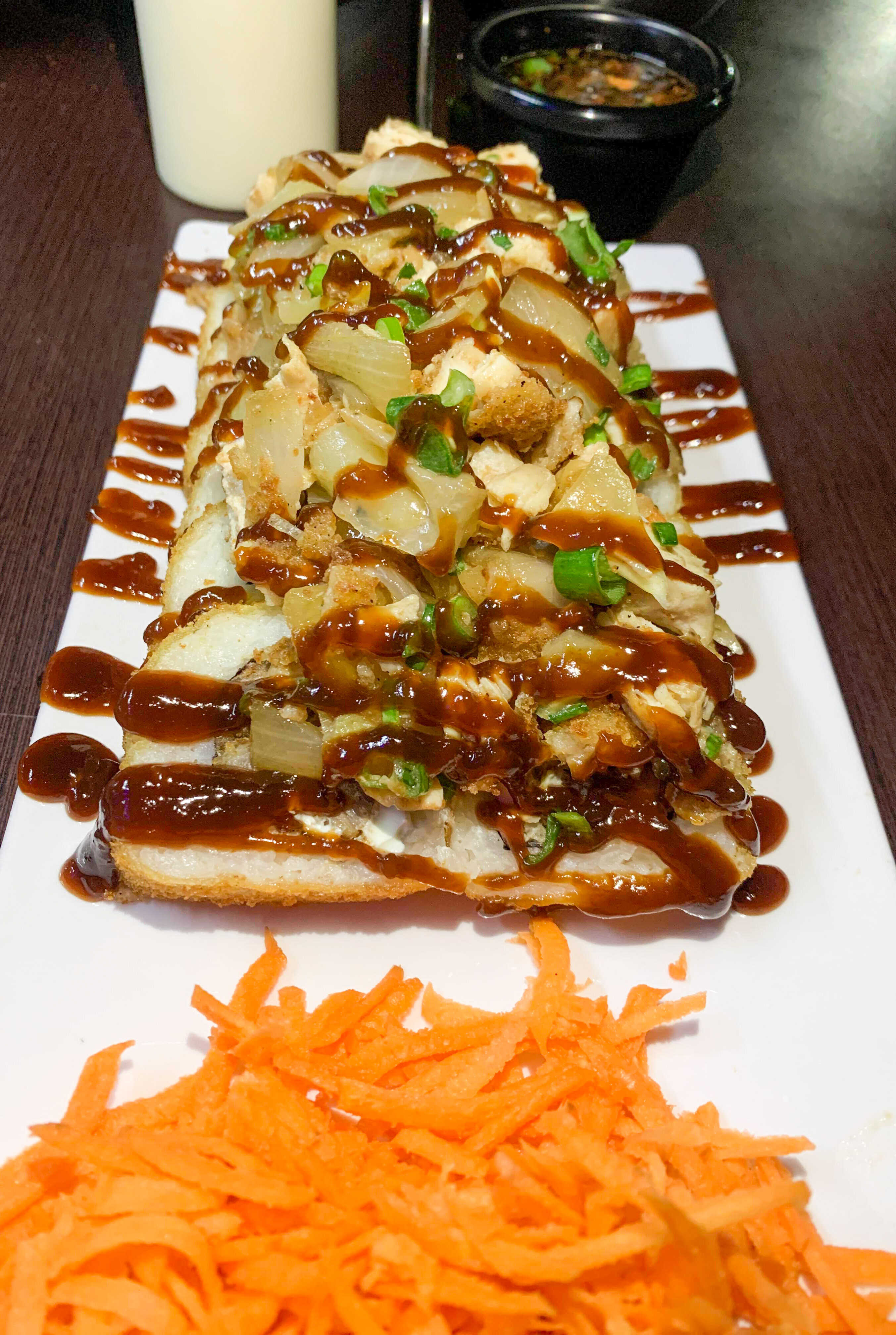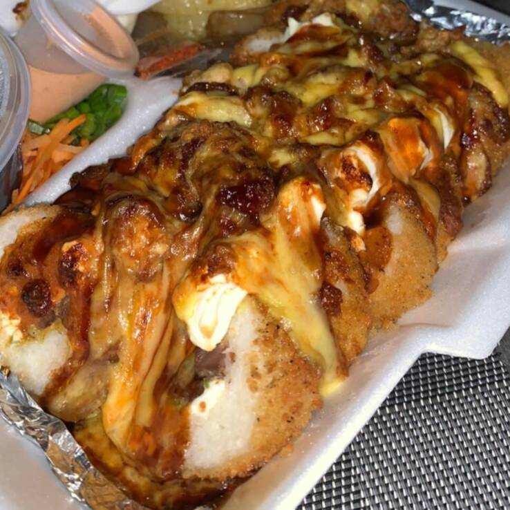 Rollo de phila, aguacate, pollo empanizado, por fuera topping de phila, queso, camarón, y anguila.
