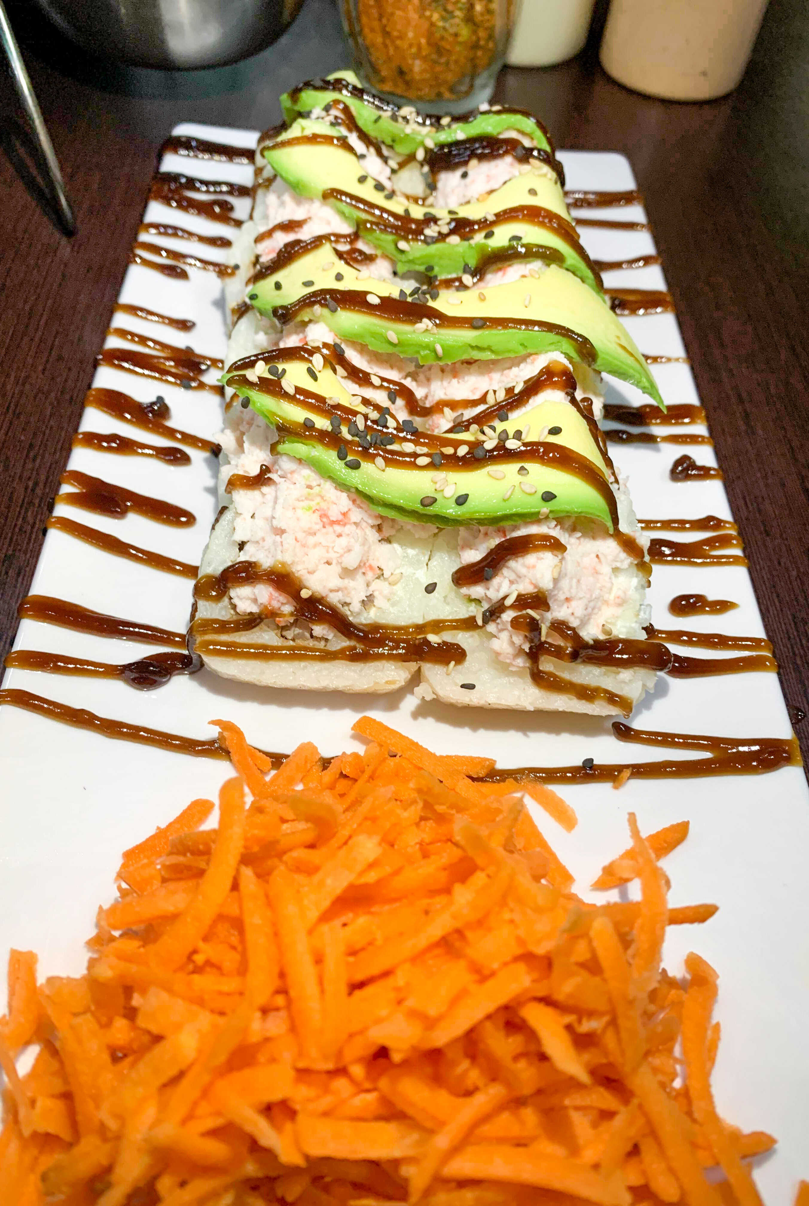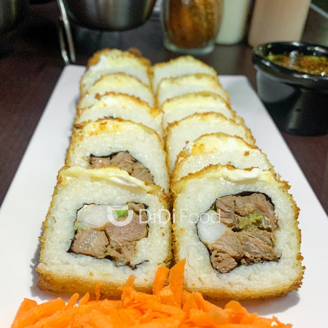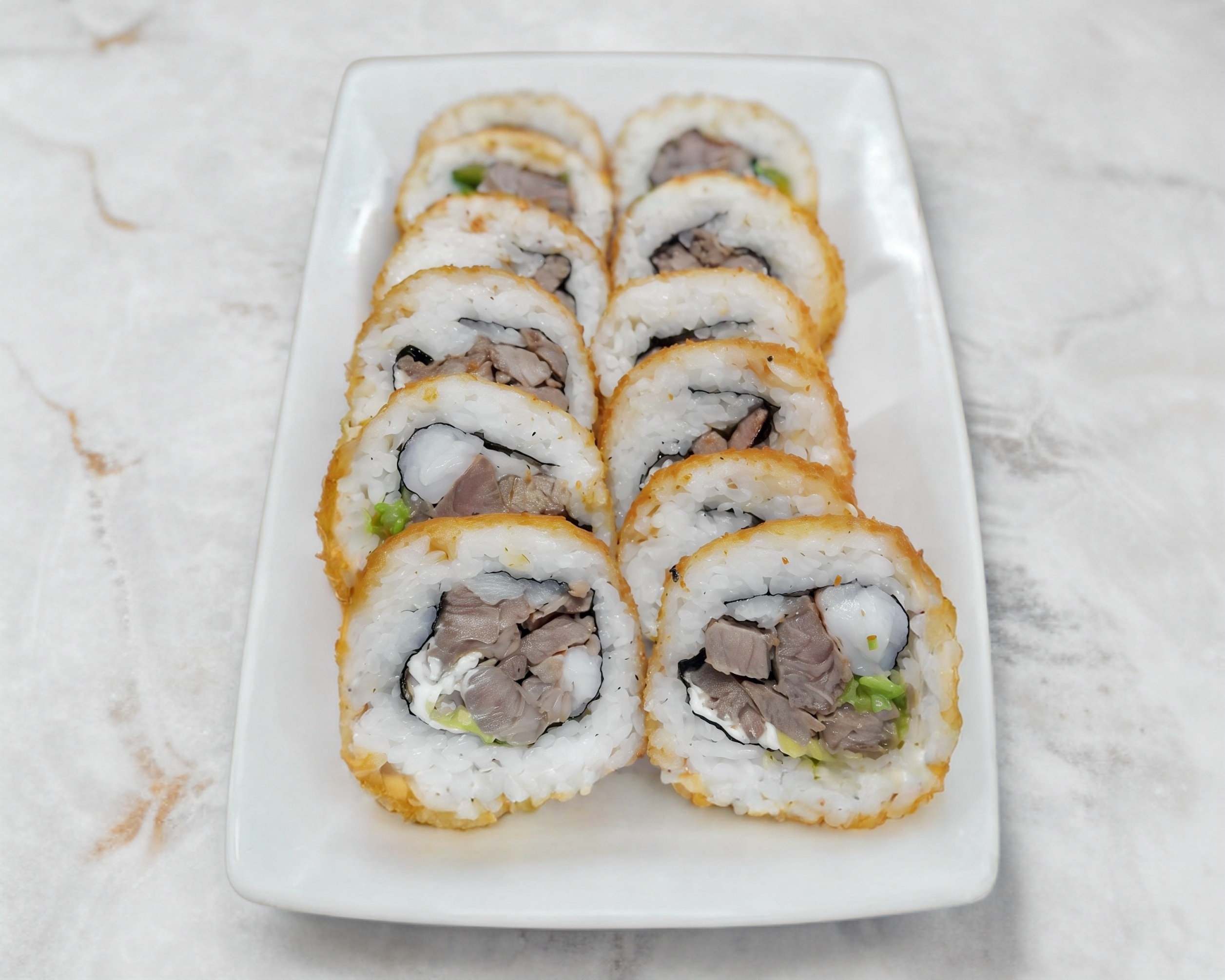 Res, pollo, phila, aguacate, topping de cangrejo empanizado, zanahoria, cebollín, bañado en anguila.
