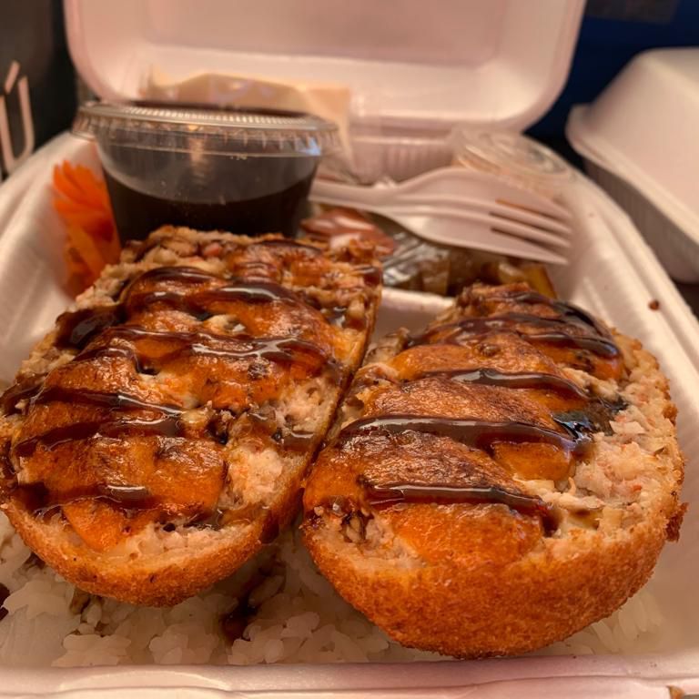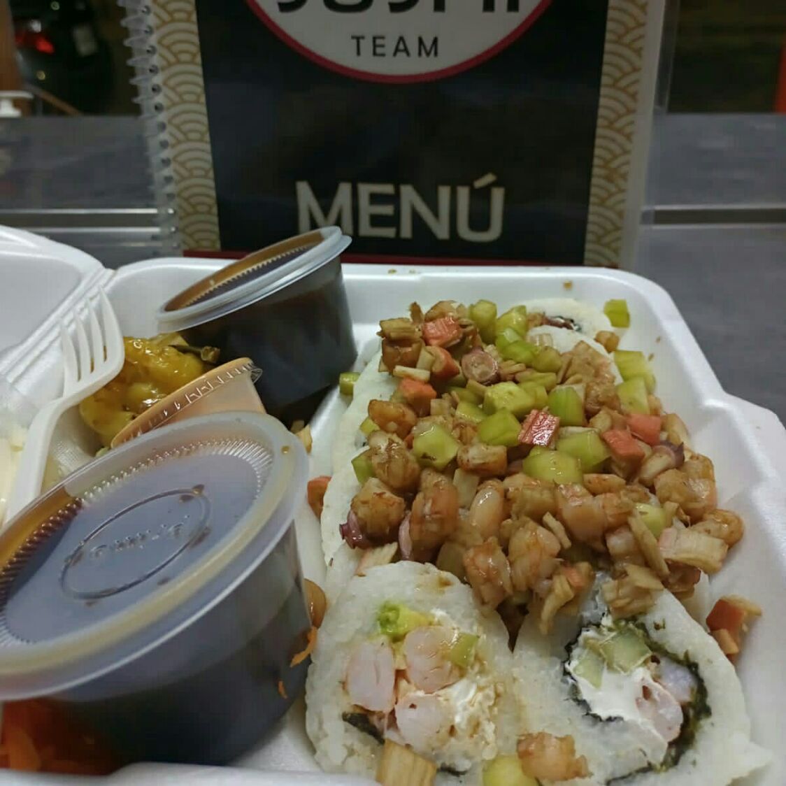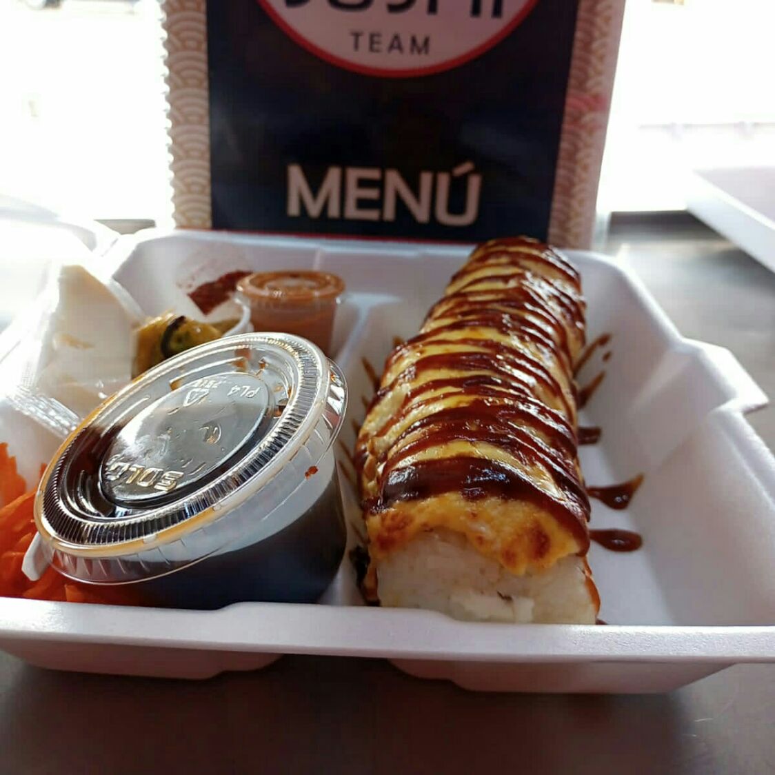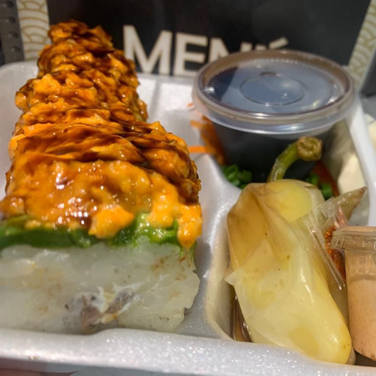 Phila, aguacate, camarón, salmón, por fuera topping de cangrejo, con cebollín, mayonesa, sriracha y bañado en anguila.