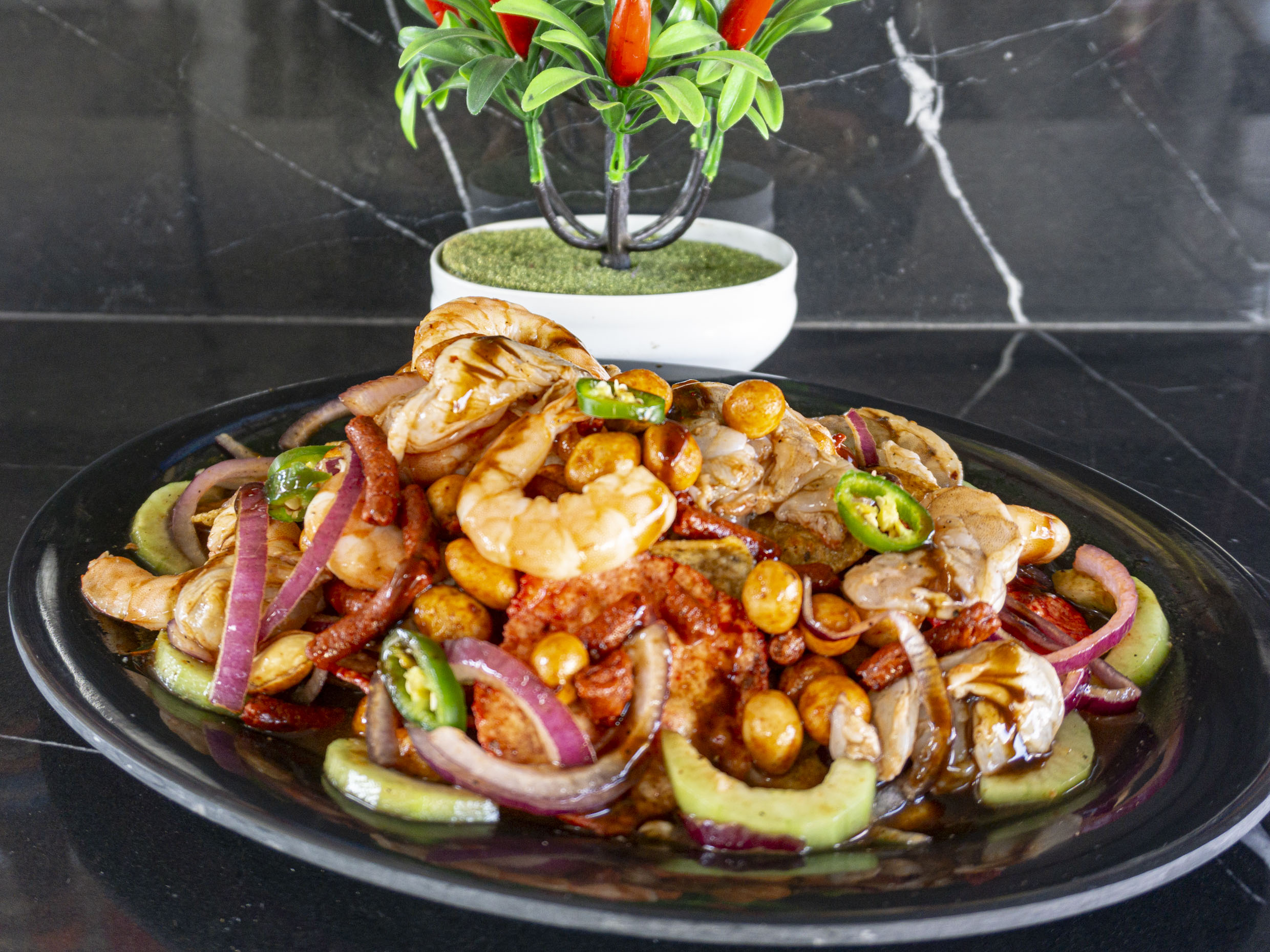 Camarón, cacahuate, rielito, pepino, cebolla y chile serrano