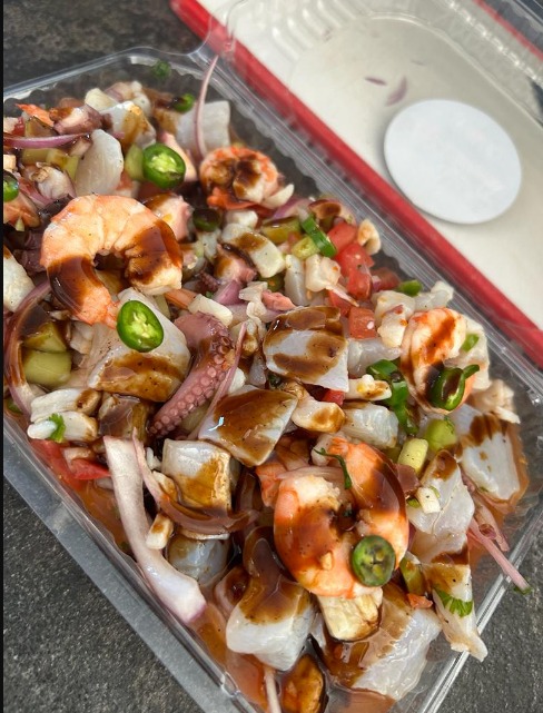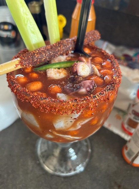 Camarón cocido, pulpo, cebolla, pepino, tomate, salsas.