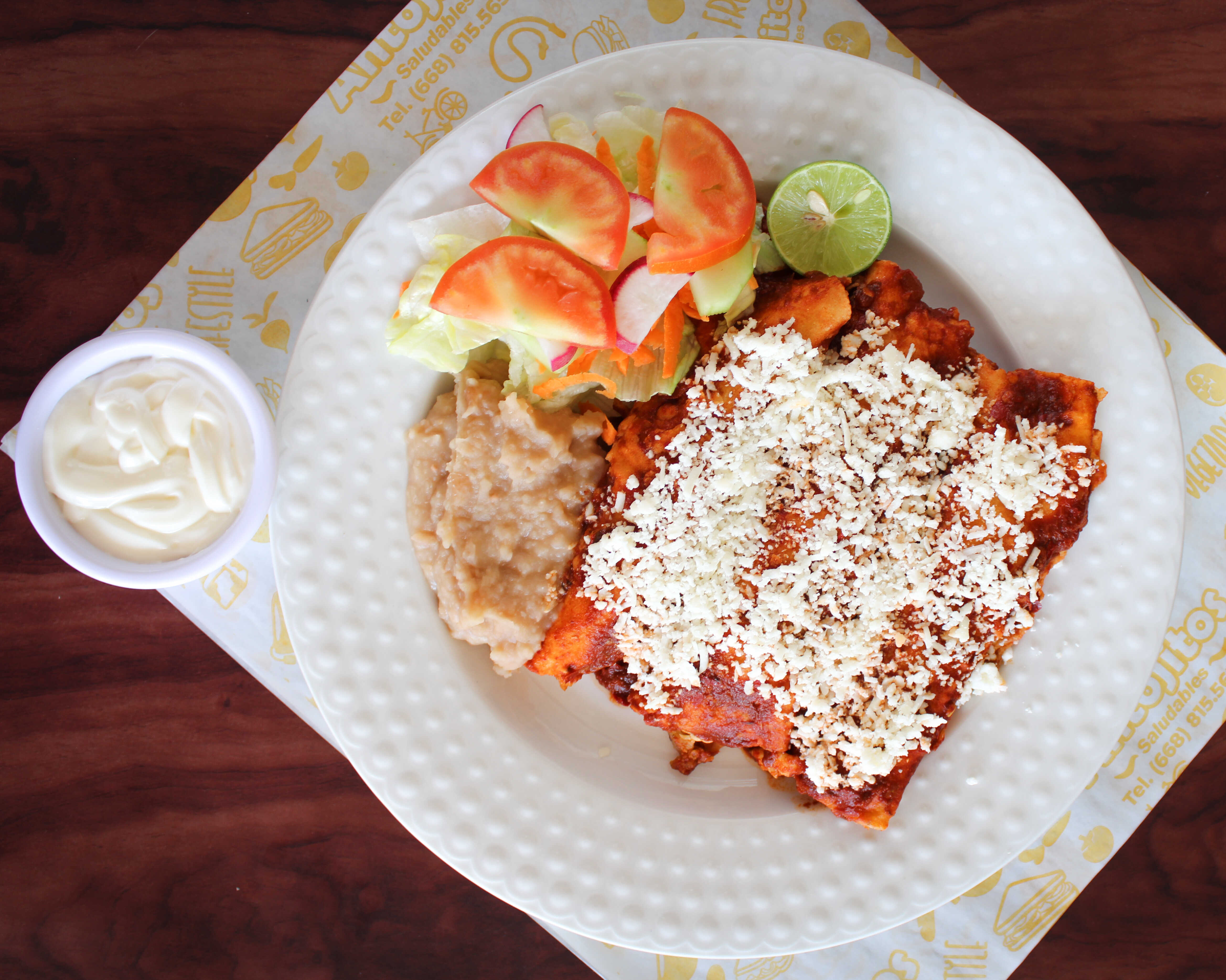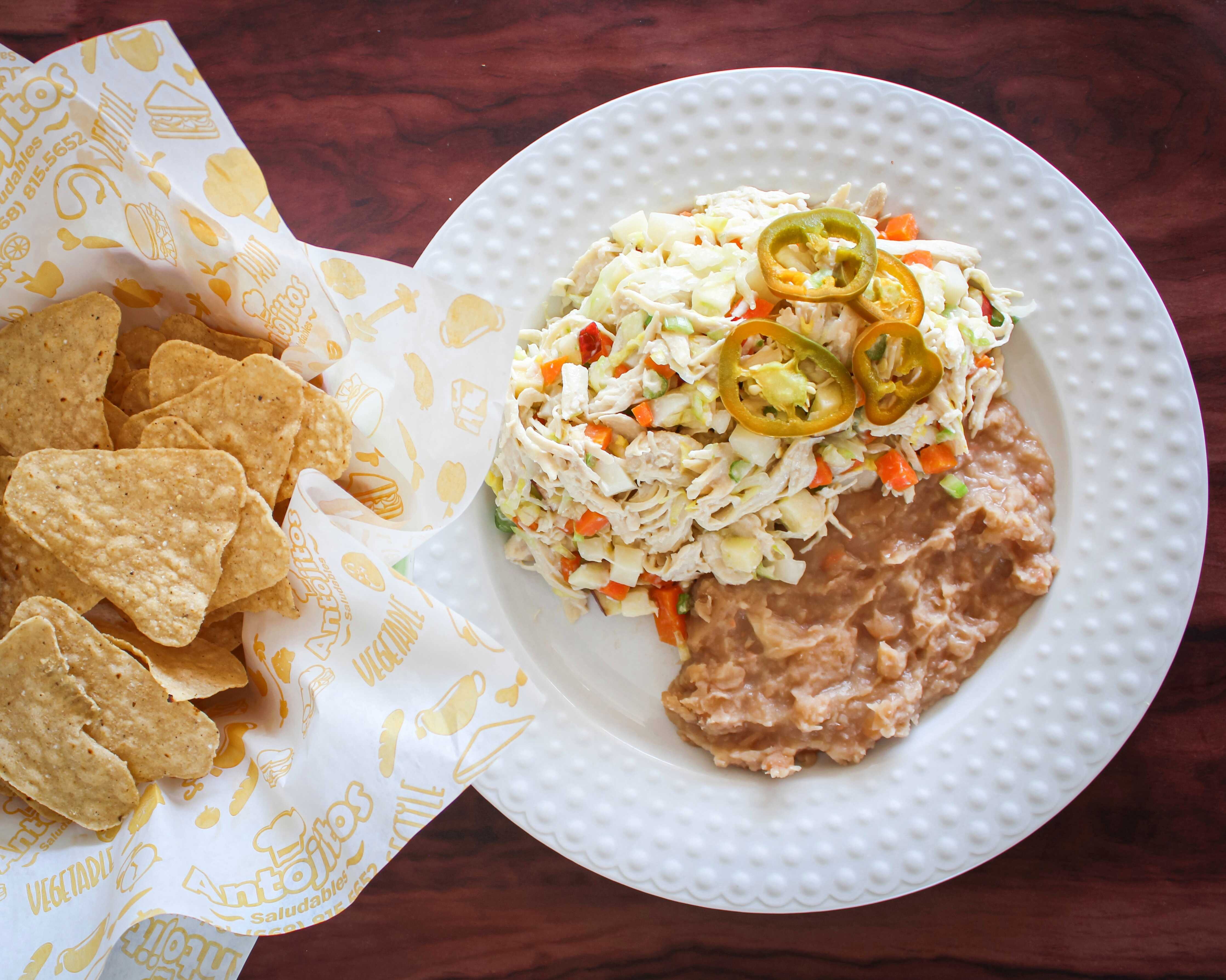 papa, zanahoria, lechuga y mayonesa acompañada de totopos y frijoles.