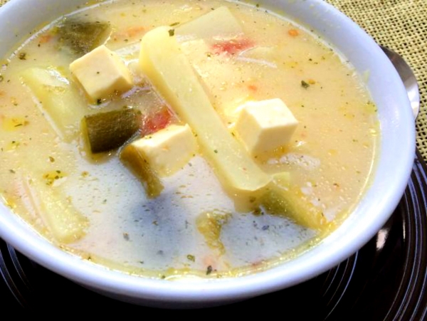 Caldillo con queso fresco y cubitos de papa, acompañada de arroz a vapor.