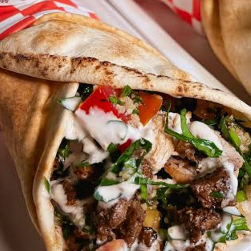 Delicioso Shawarma envuelto en pan pita con una base cremosa de hummus y crema de ajo. Preparado con vegetales frescos (tomate, cebolla, perejil), aguacate y un toque de aceite de oliva. Incluye chiles jalapeños y papas a la francesa.