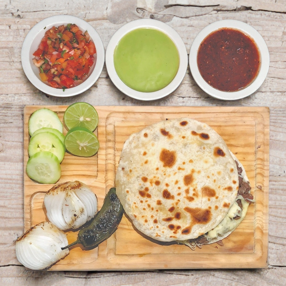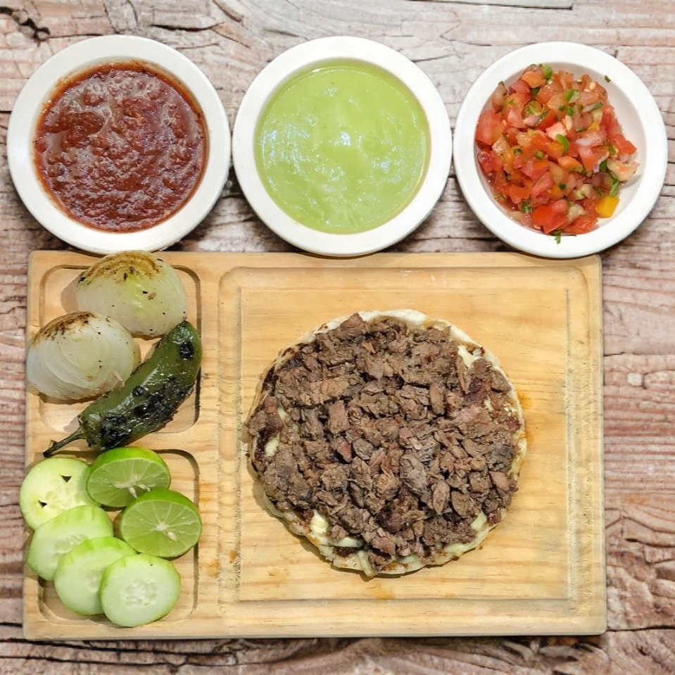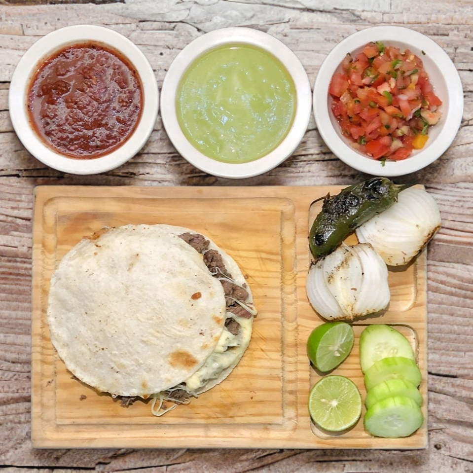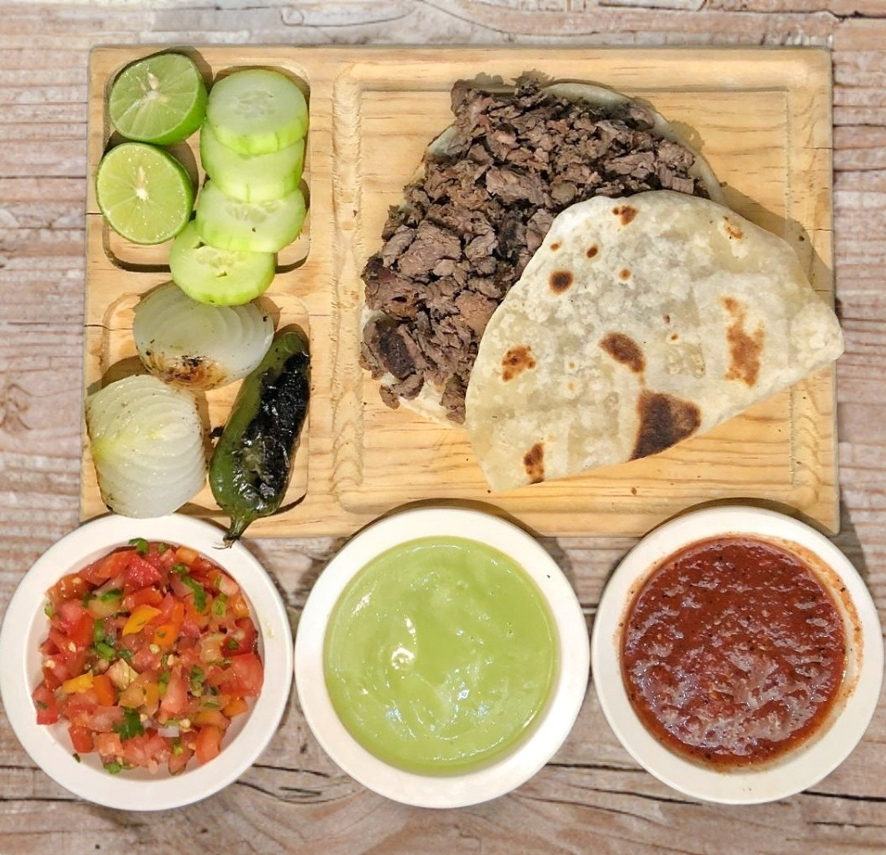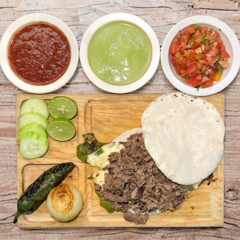 Tortilla de harina con trozos de carne de sirloin, acompañados de salsas de la casa y guacamole.