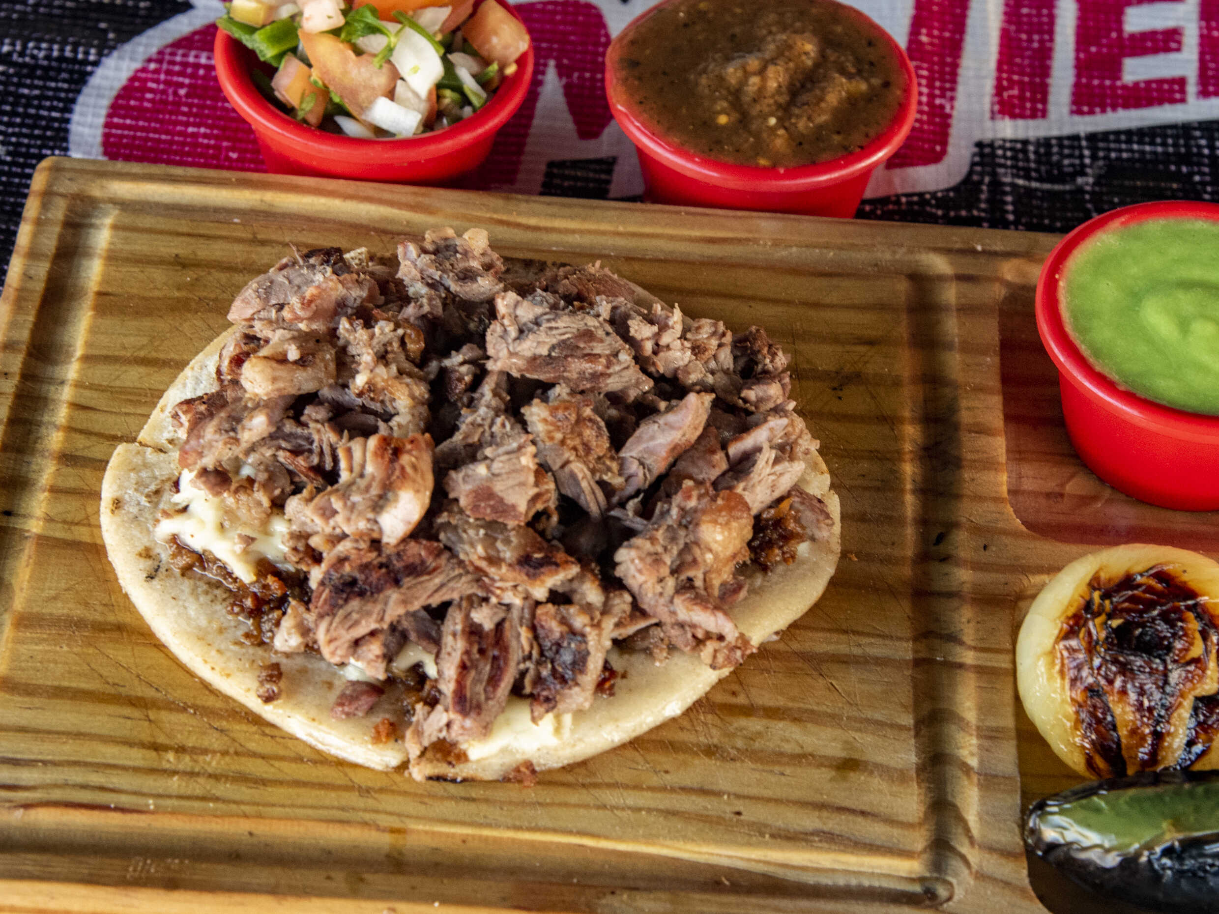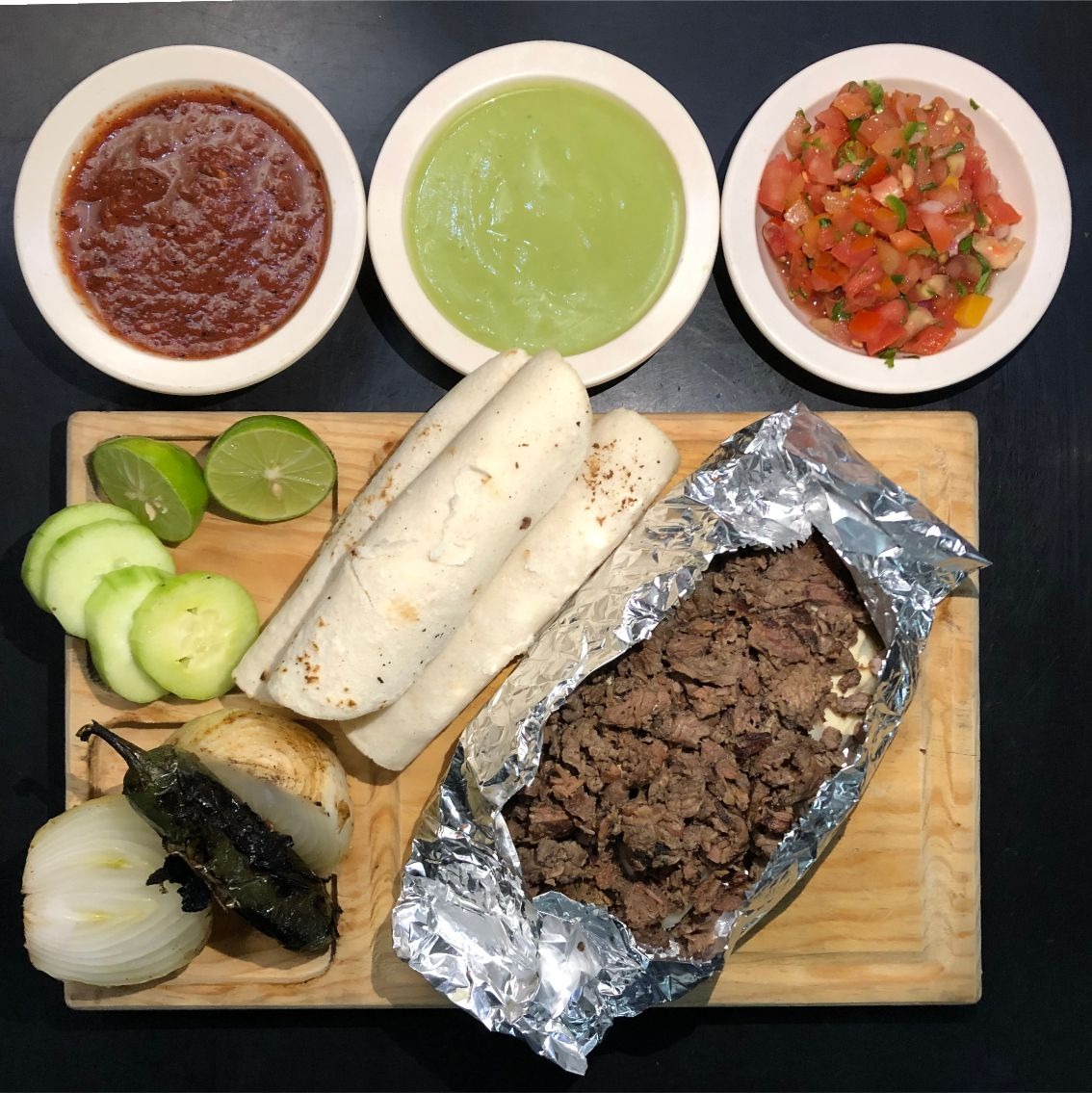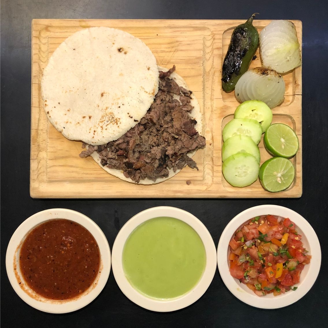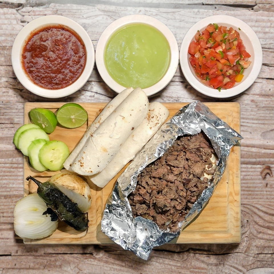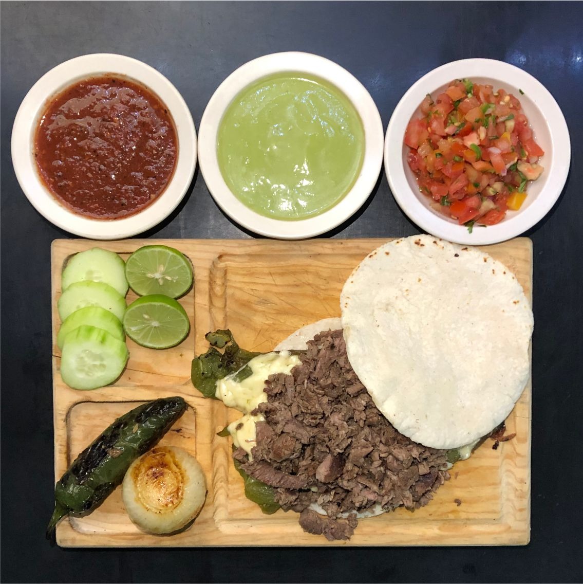 Tortilla de maíz con trozos de carne de sirloin, acompañados de salsas de la casa y guacamole.