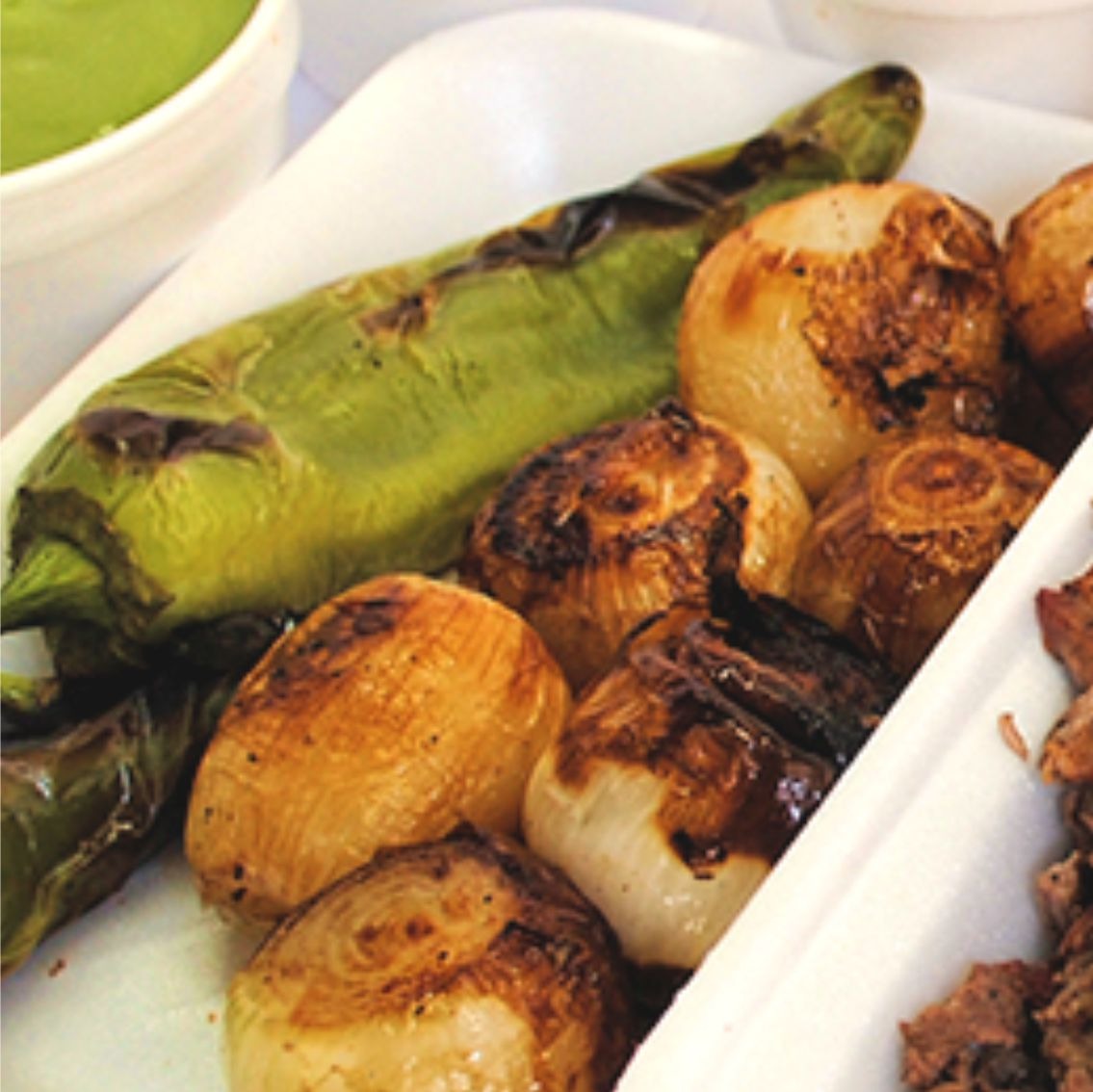 Taco con doble tortilla de maíz cubierta con una capa de chile anaheim tatemado, queso al gratín y trozos de sirloin.