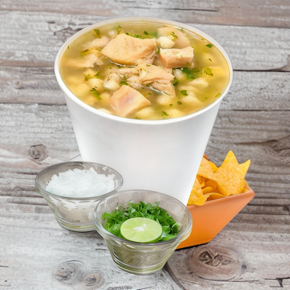 Delicioso litro de menudo con sabor casero, acompañado con totopos, cilantro, cebolla y limones por separado.