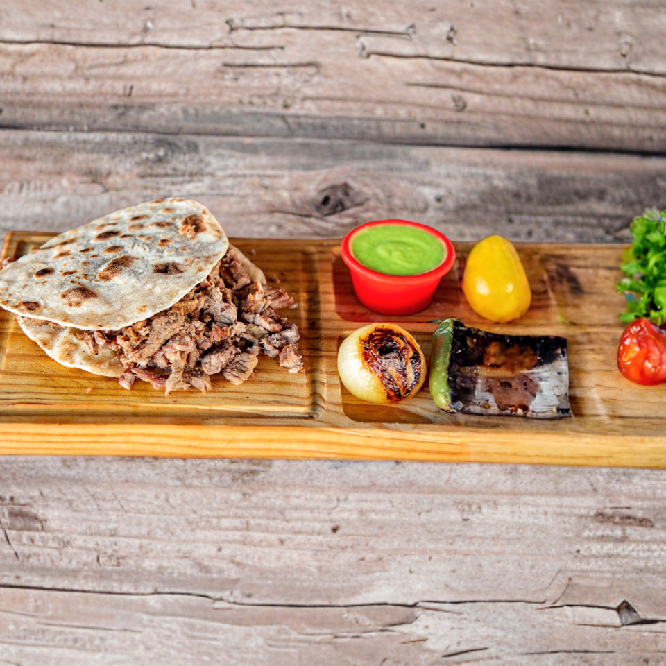 1/4 de Orden de Carne Asada (250gr) + Salsa y Guacamole + Orden de Cebollitas Asadas + Orden de Tortillas (6 piezas) + 3 Tacos de Frijol para una persona