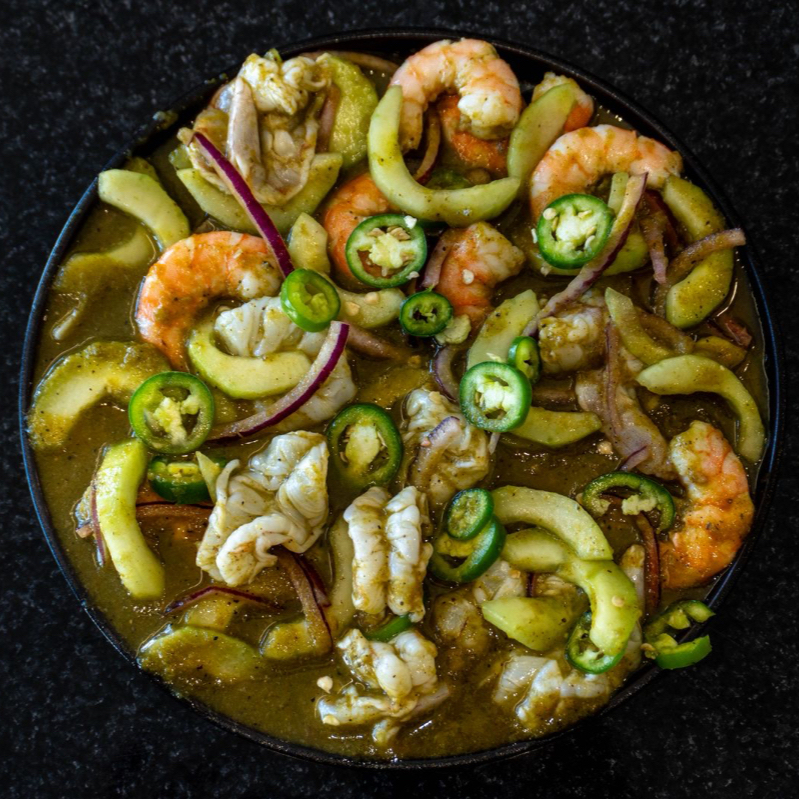 Aguachile de Camaron en salsa Verde con Pepino y Cebolla