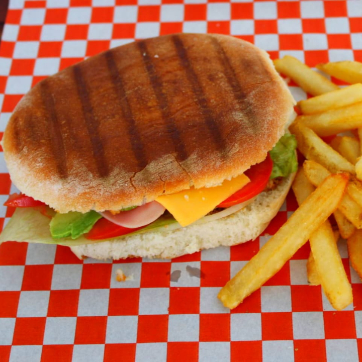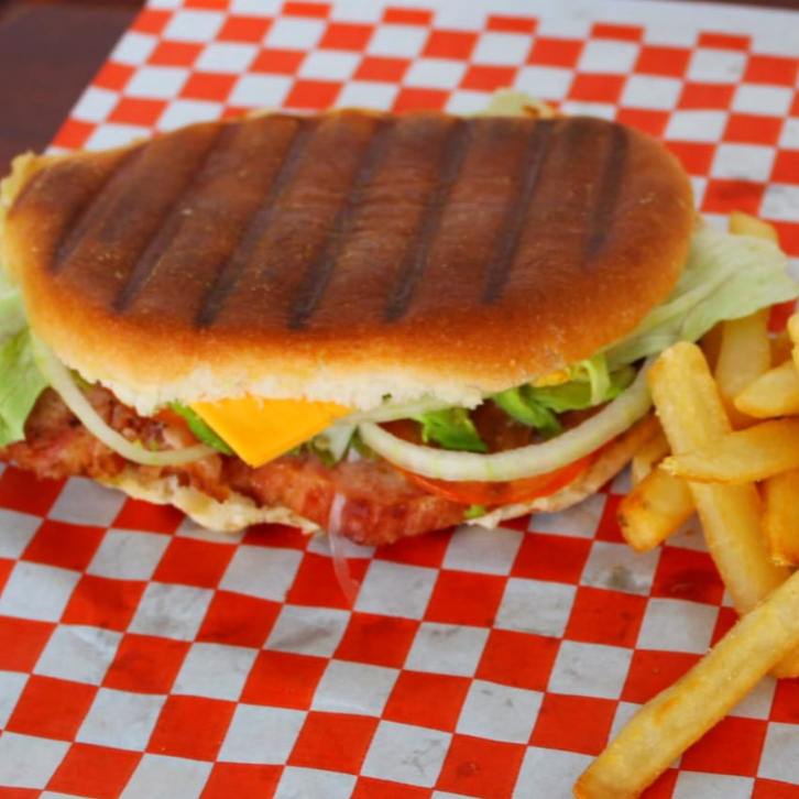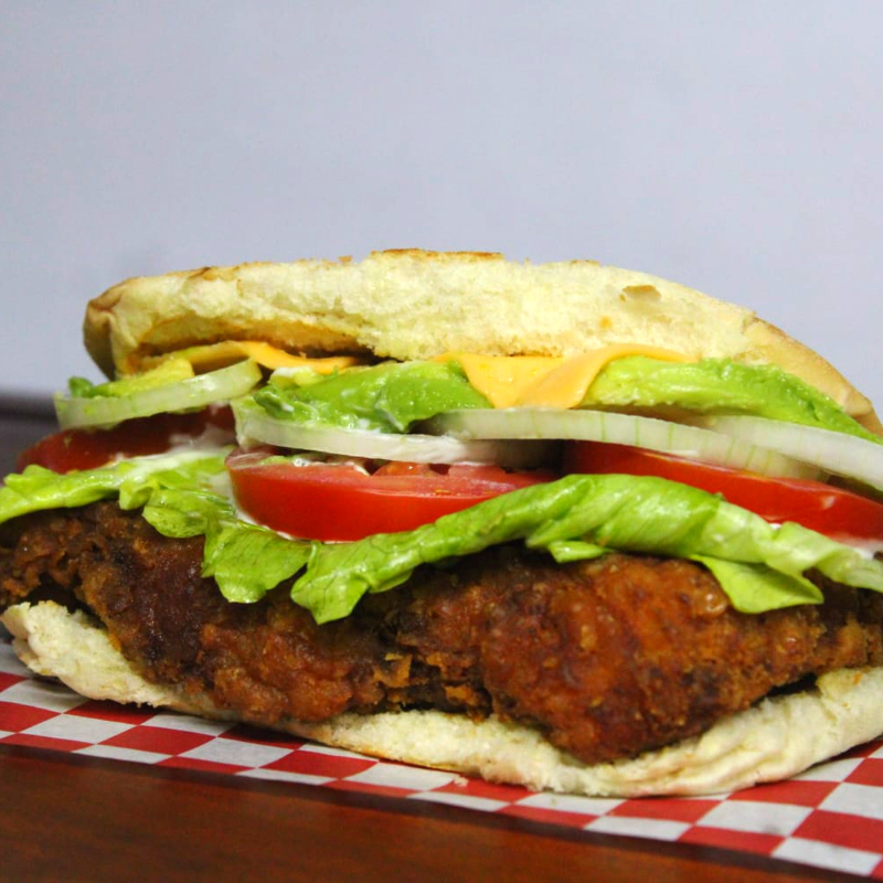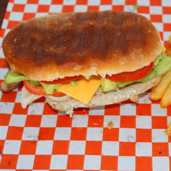 Milanesa de pollo empanizada, lechuga, tomate, cebolla, Chile jalapeño, aguacate, queso y jamón, acompañada de papas a la francesa.