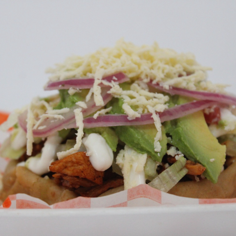 Sope con carne Marinada de la casa, lechuga, Cebolla curtida, Tomate,crema , Aguacate, Queso y Salsa verde