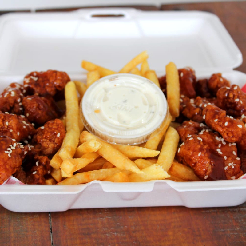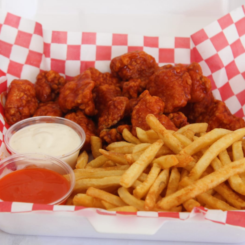 Boneless Receta de la casa, Bañados en salsa a escoger, Bbq o Bbq Mango Habanero o Red Hot , acompañados de papas y 2 aderezos , Ranch y/o mostaza miel o Picante