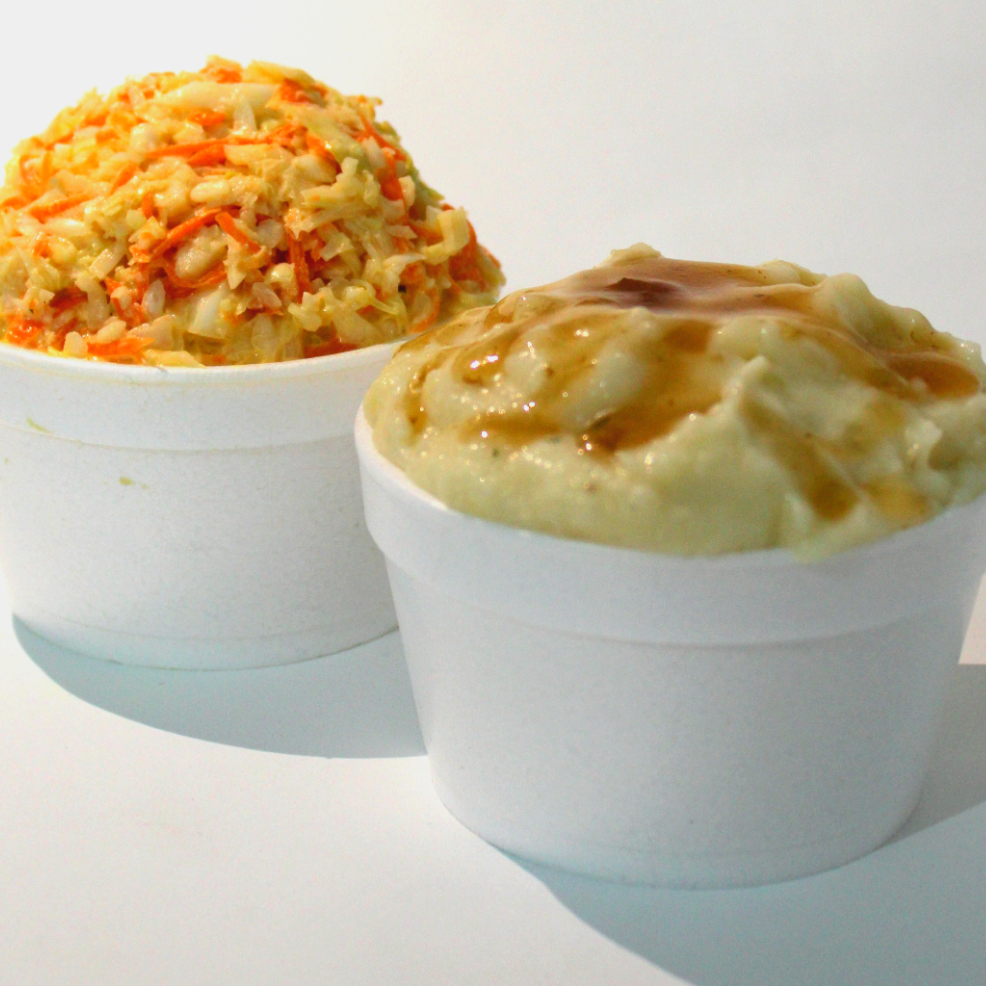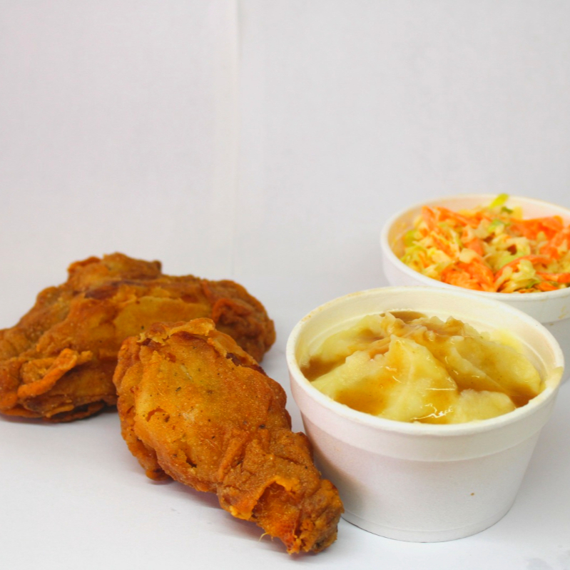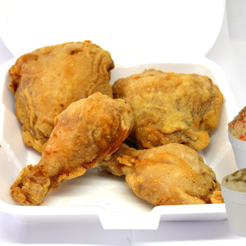 4 Piezas de pollo frito acompañadas de 1 pure de papa y 1 ensalada de col, salsa verde de la casa