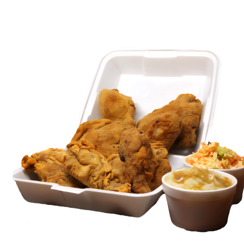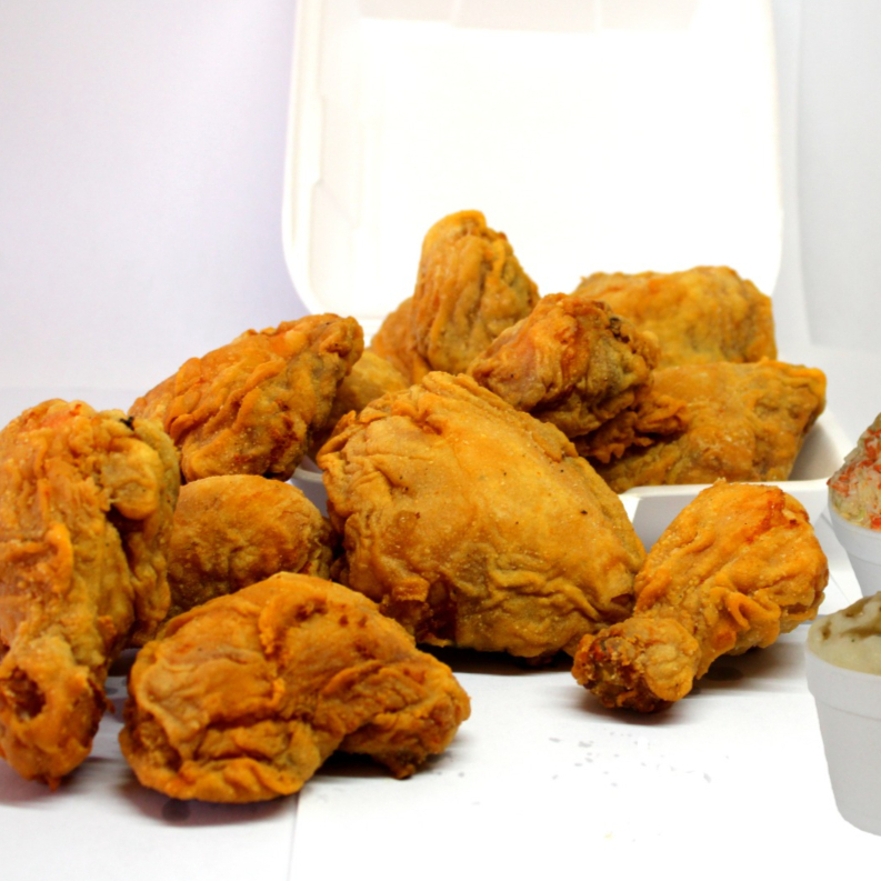 12 Piezas de Pollo Frito acompañadas de 3 Pure de papa y 3 Ensaladas de col y salsa verde de la casa