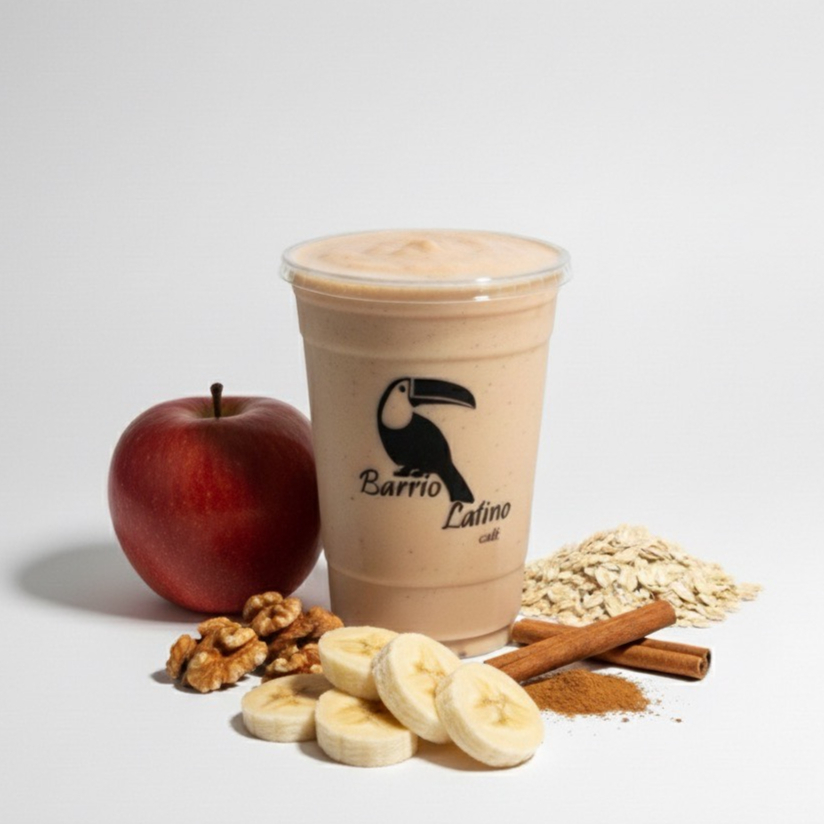 Plátano, manzana roja, nuez, canela y avena con leche