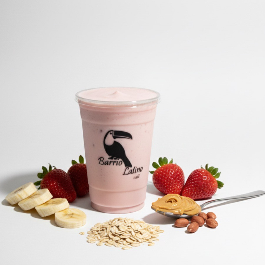 Fresa, plátano, avena, crema de cacahuate y dragón fruit con leche