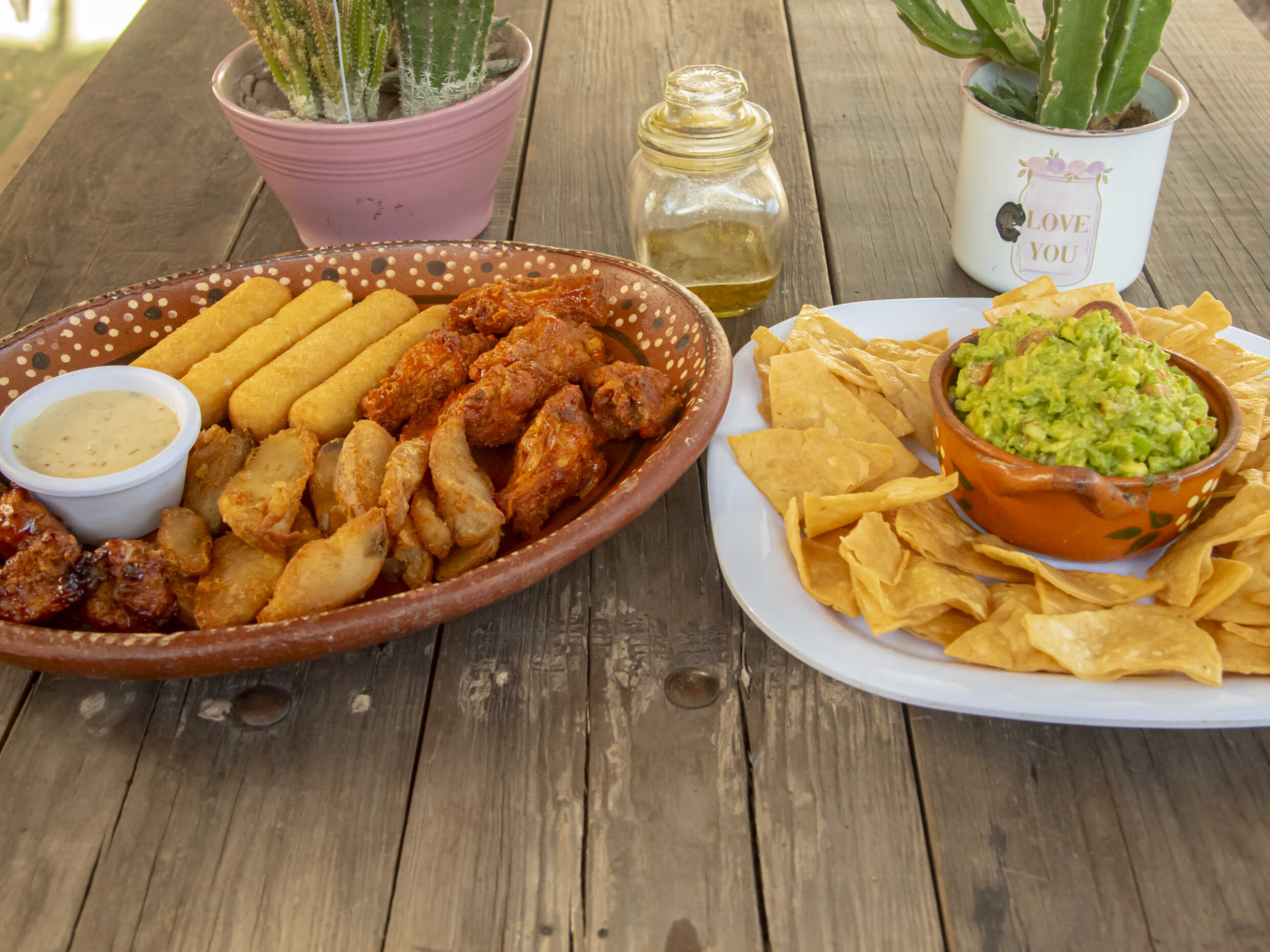 6 Piezas de alitas, media orden de boneless, 4 dedos de queso, papas sazonadas y guacamole con totopos