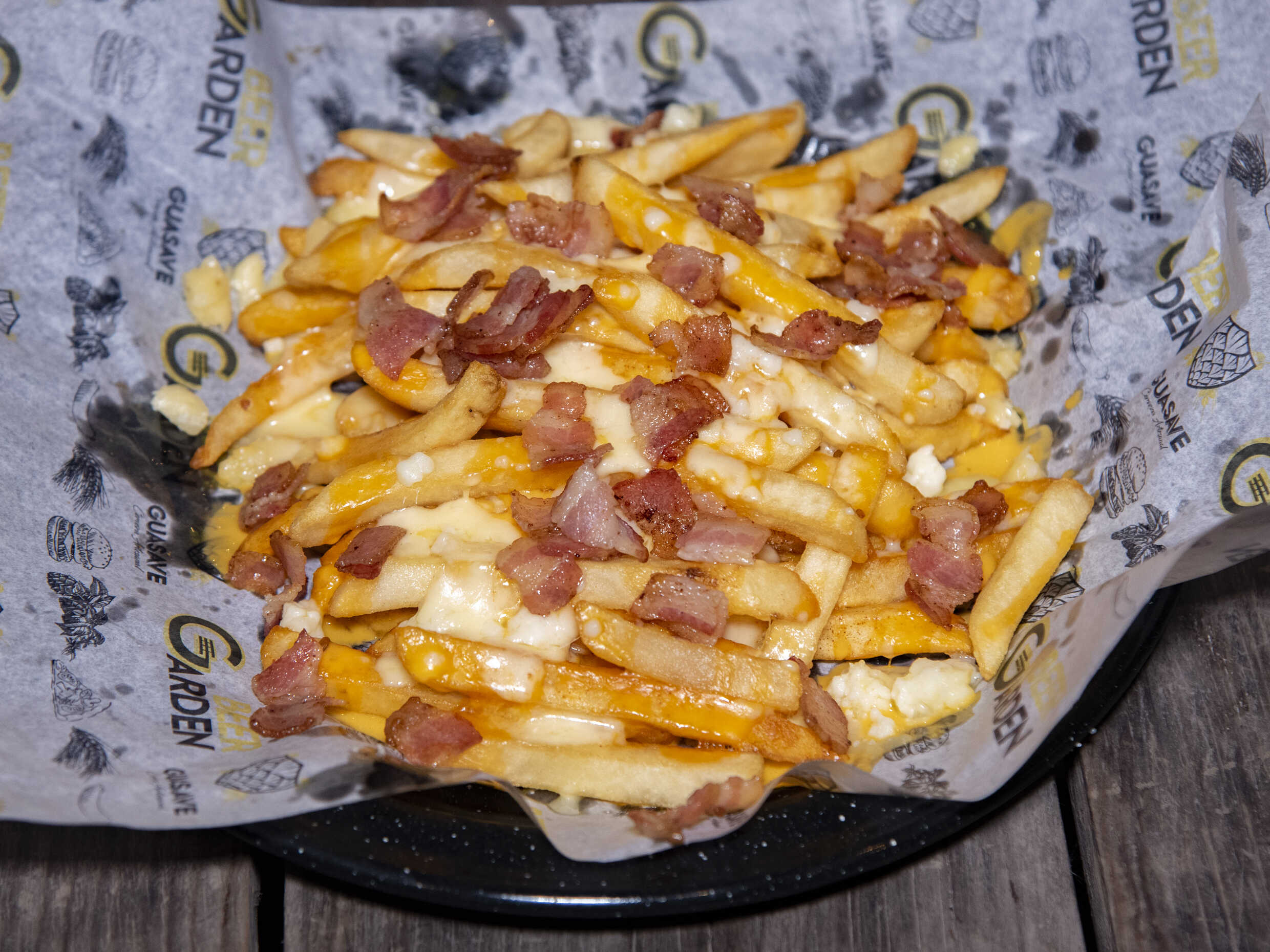 Papas a la francesa bañadas en queso gratinado y tocino en trozos.