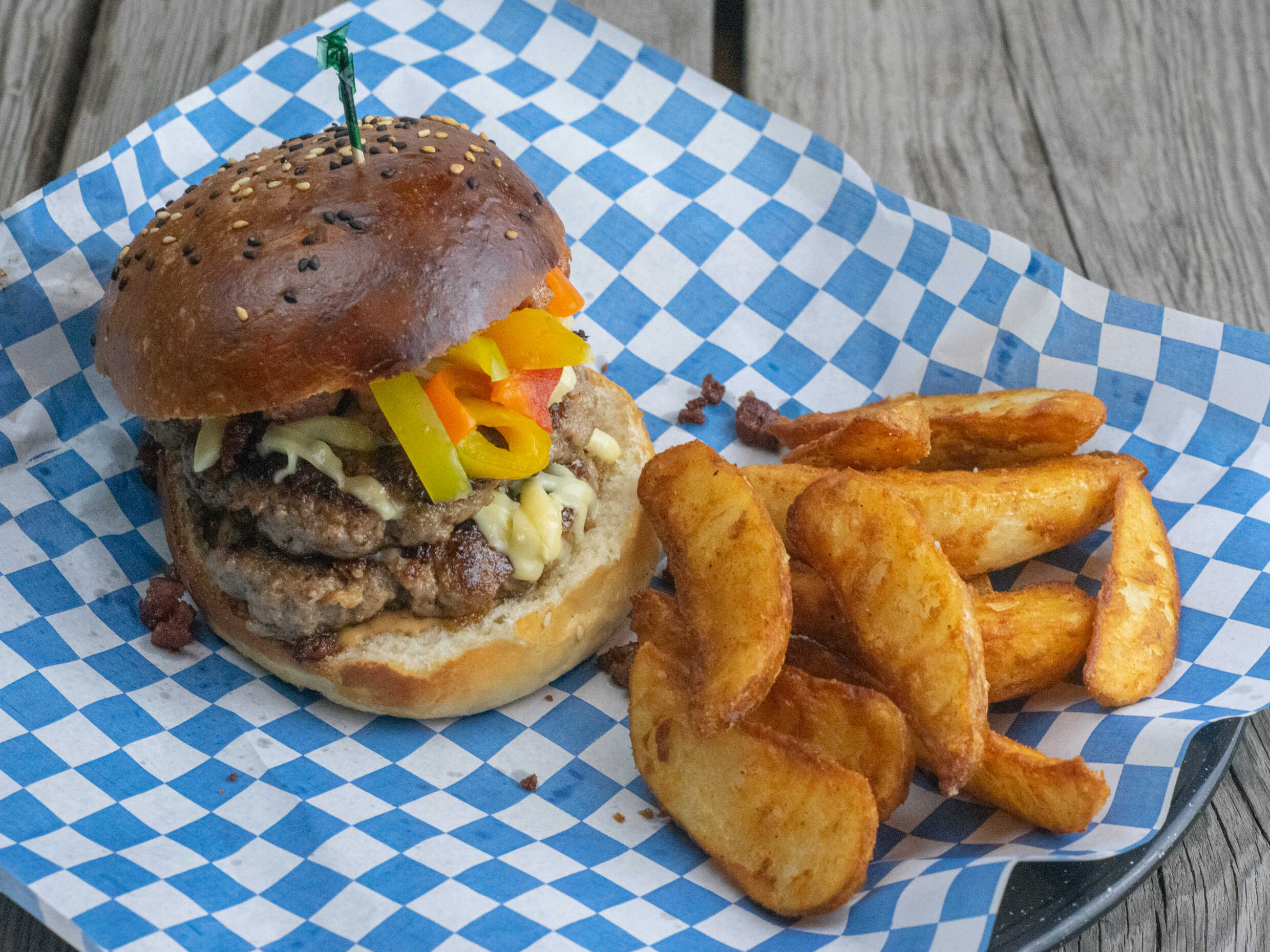 Pan artesanal, doble carne, queso, tocino y guacamole. Acompañada de papas francesas