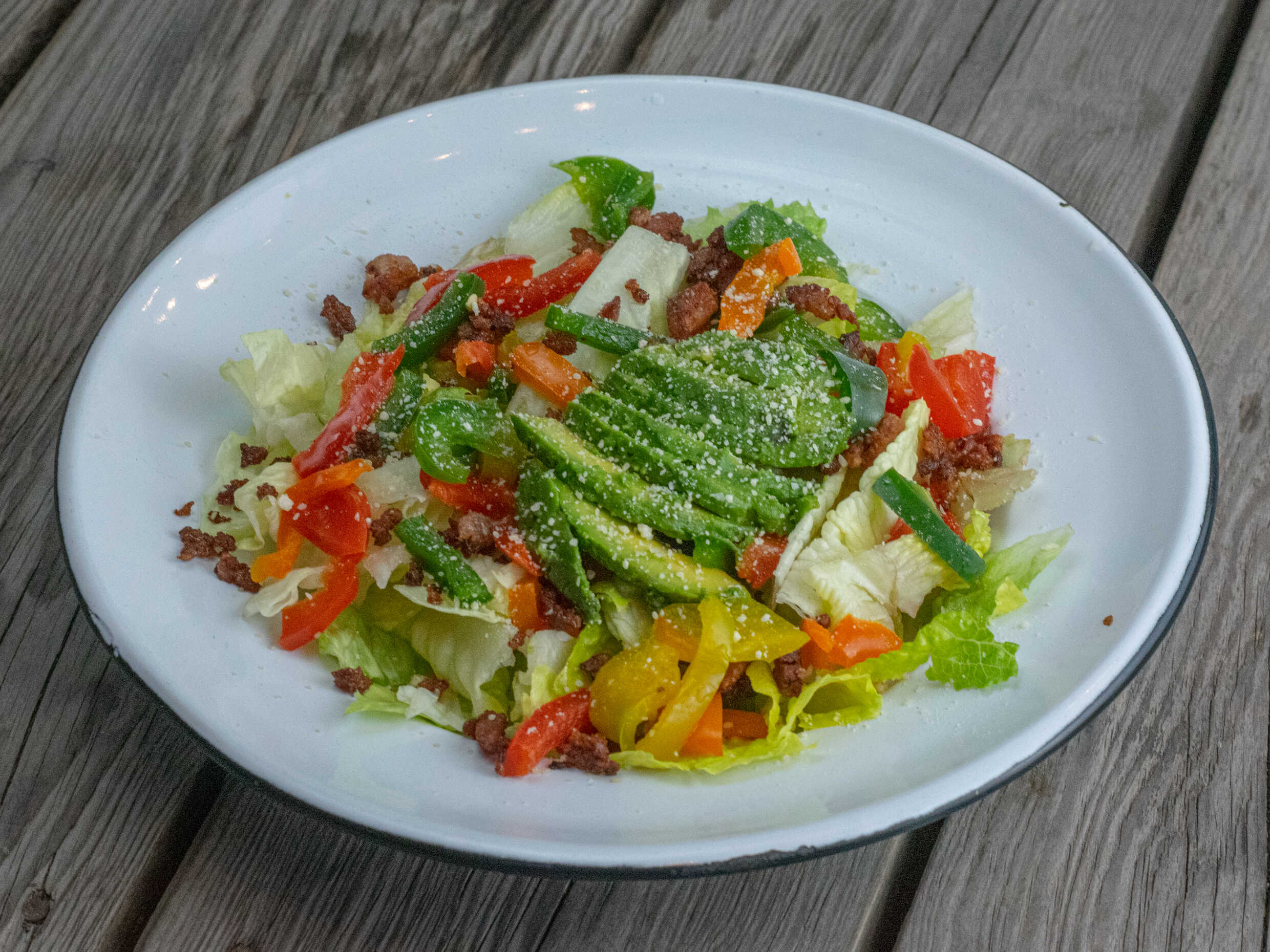 Mix de lechuga, aguacate, tomate, tocino, pimiento, queso parmesano.