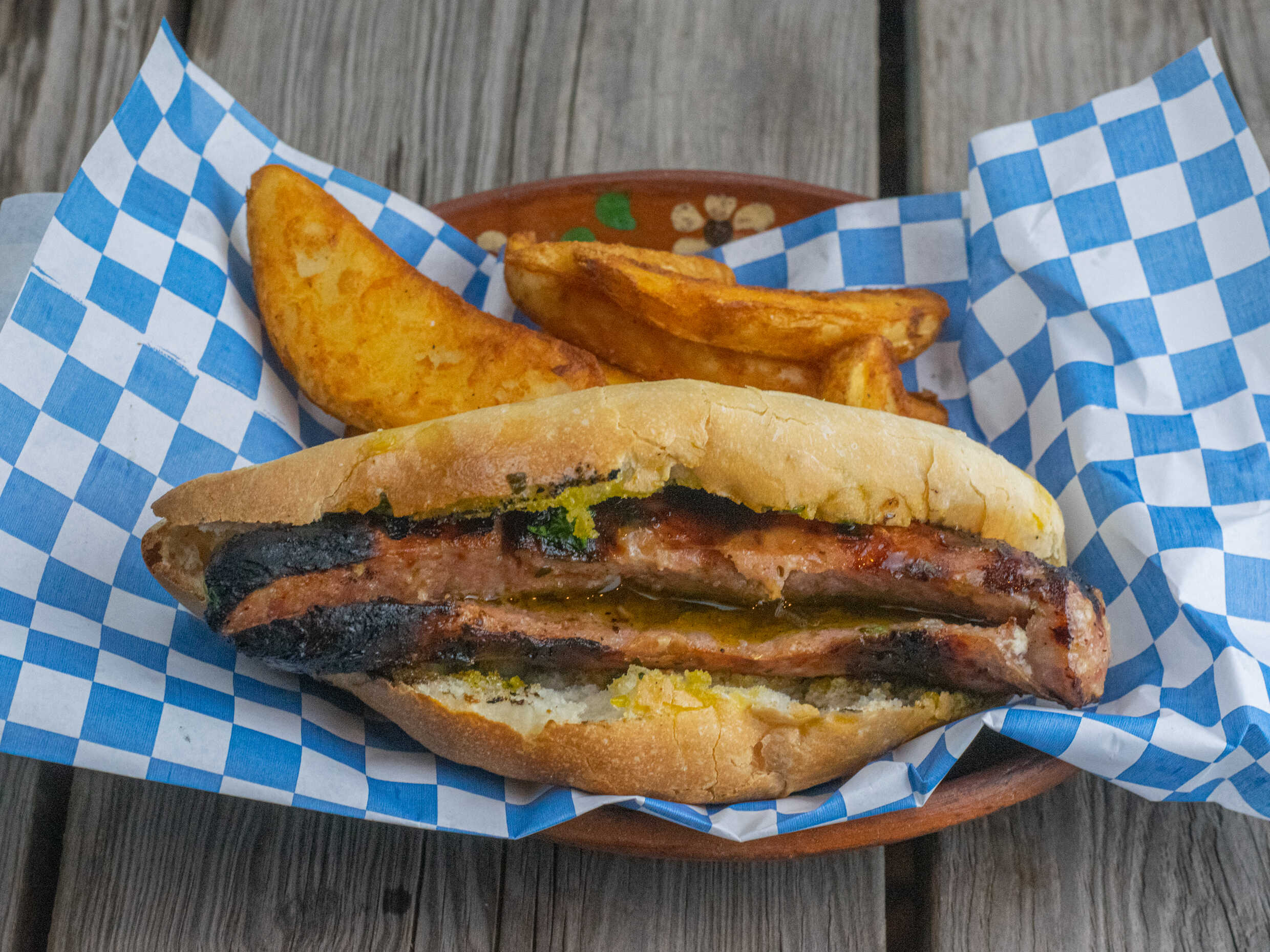 Salchicha artesanal argentina sobre un pan bolillo bañado en chimichurri.