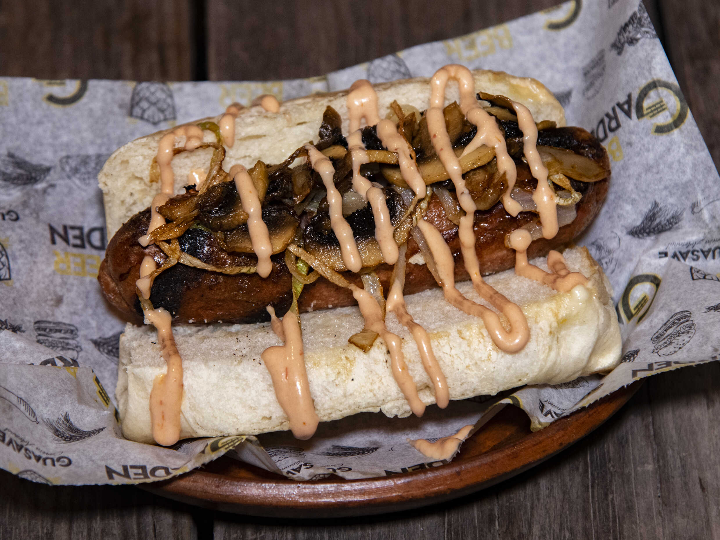 Salchicha alemana, cebolla caramelizada, champiñones y aderezos. Incluye papas francesa.