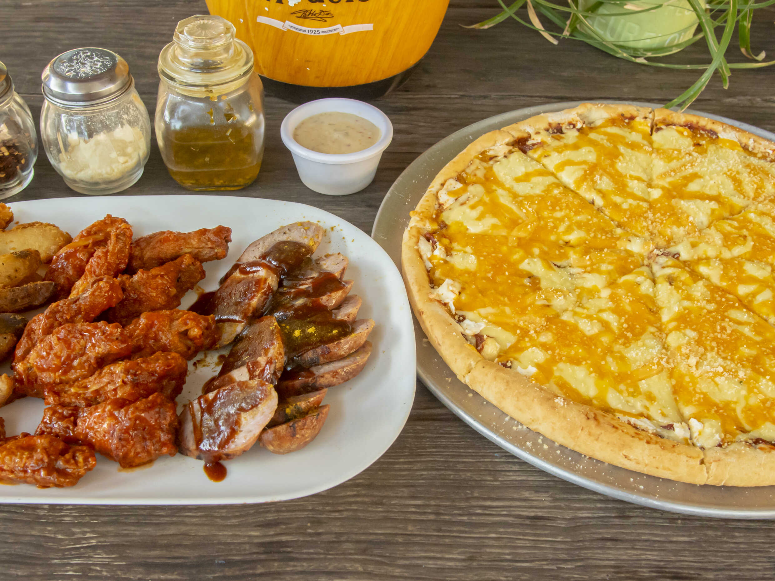 1 Pizza a elección, 12 piezas de alitas, salchicha artesanal y papas sazonadas.