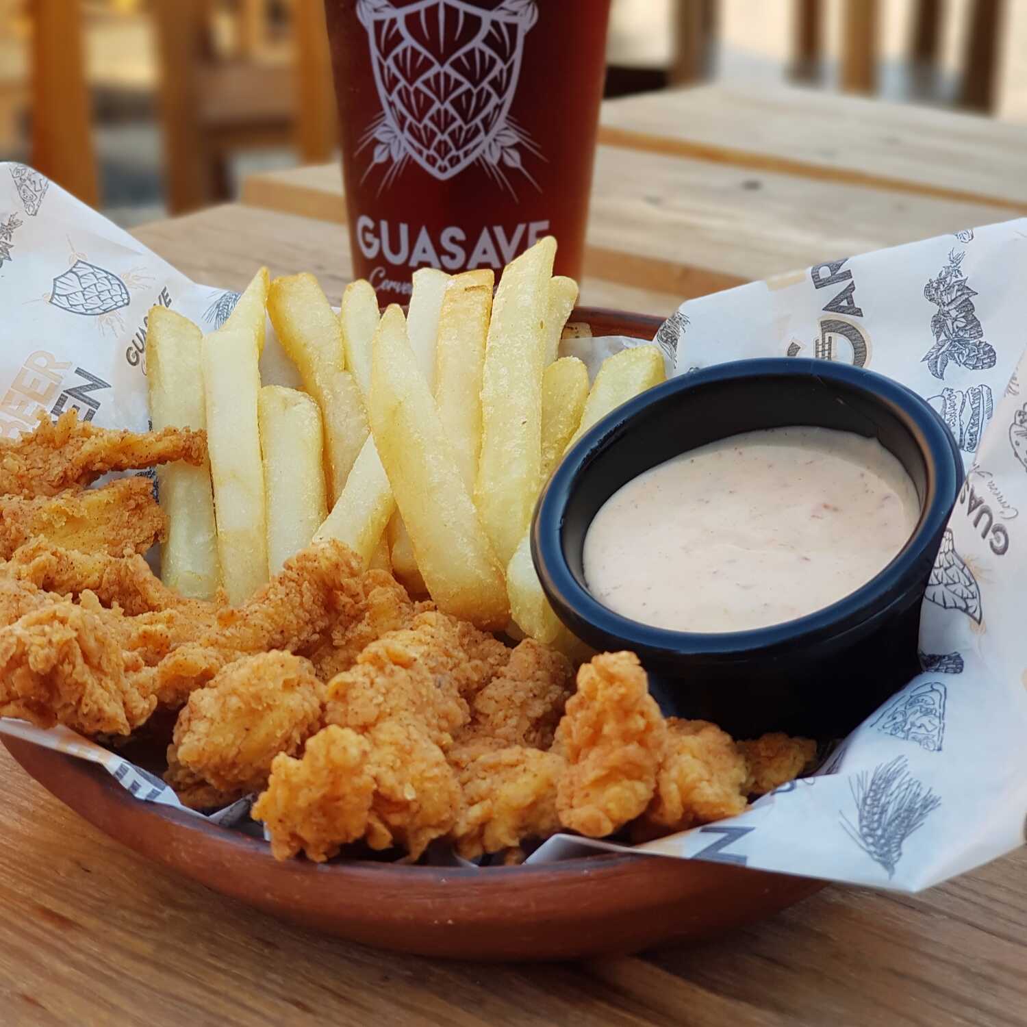 Tiras de pollo empanizadas con aderezo ranch. Incluye papás a la francesa