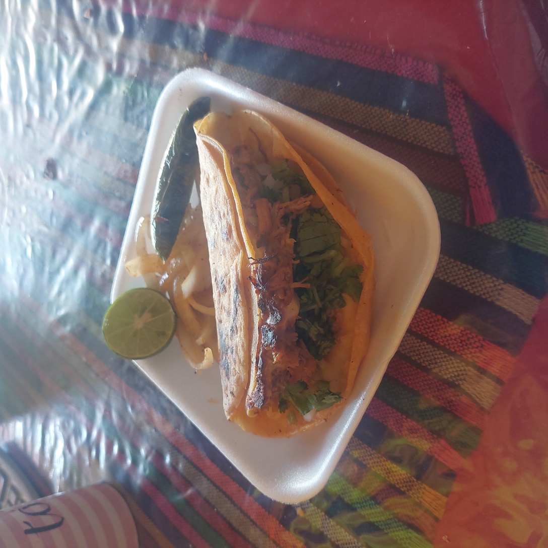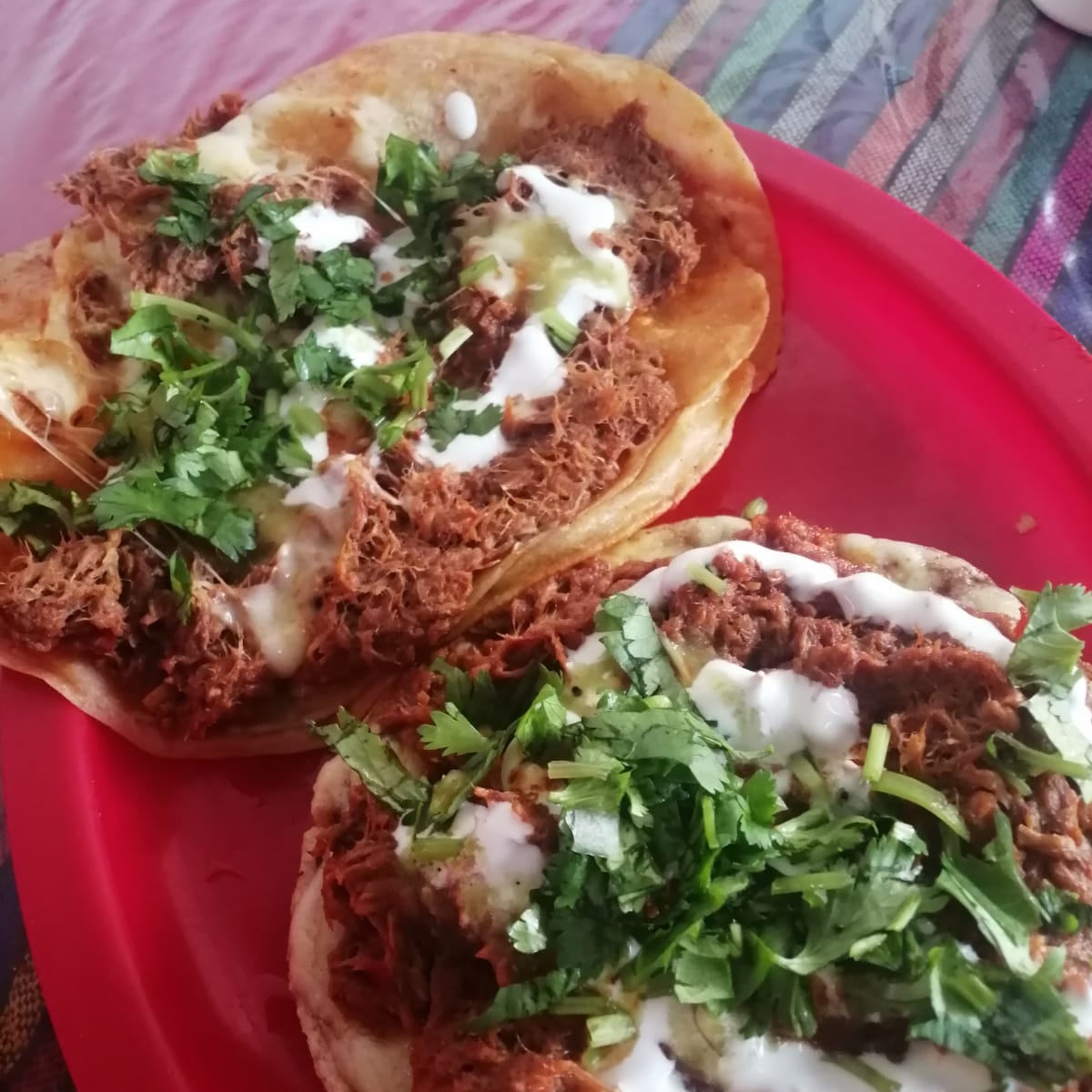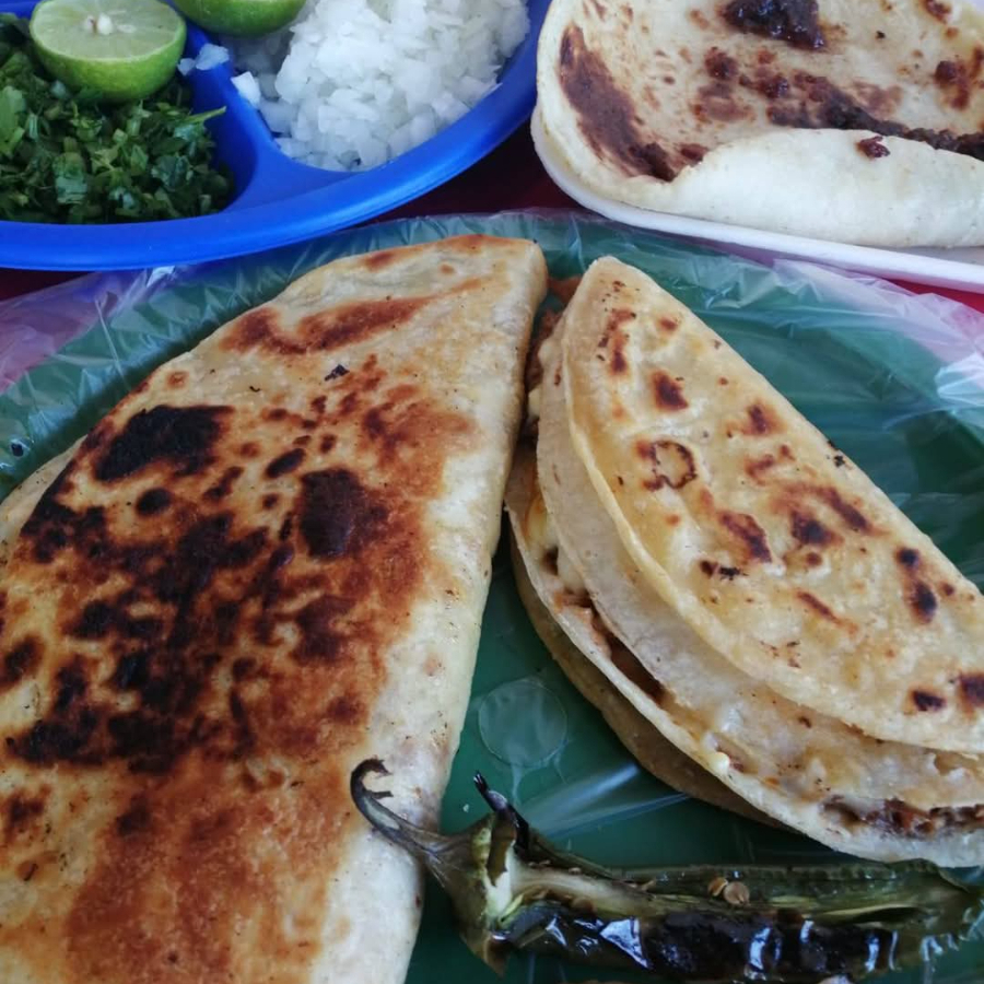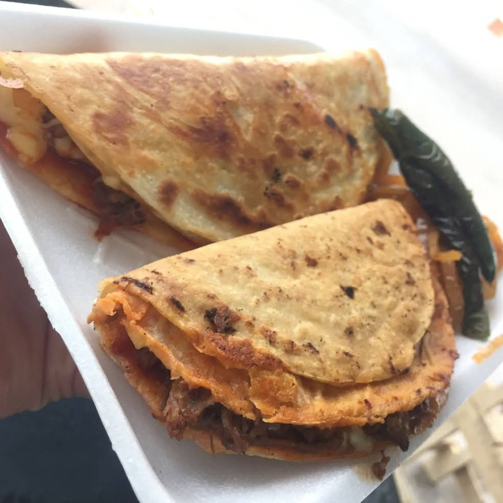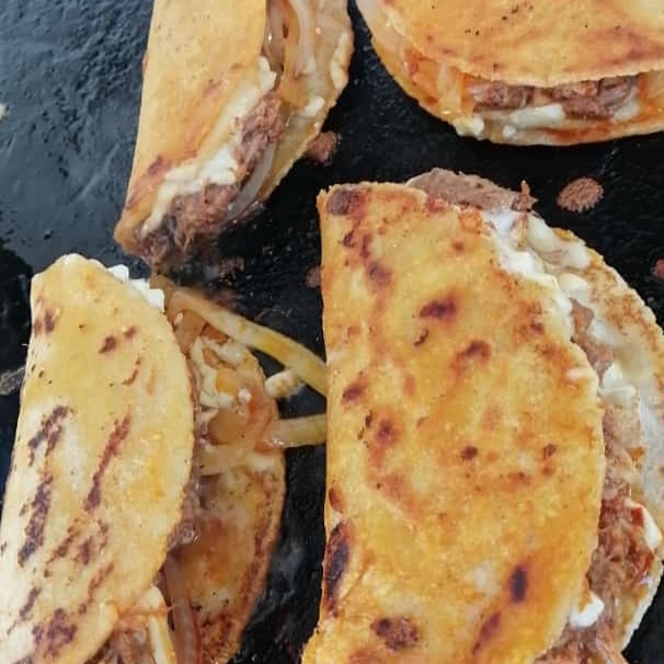 2 quesabirrias dd harina, tortilla doble birria marinada y queso gratinado