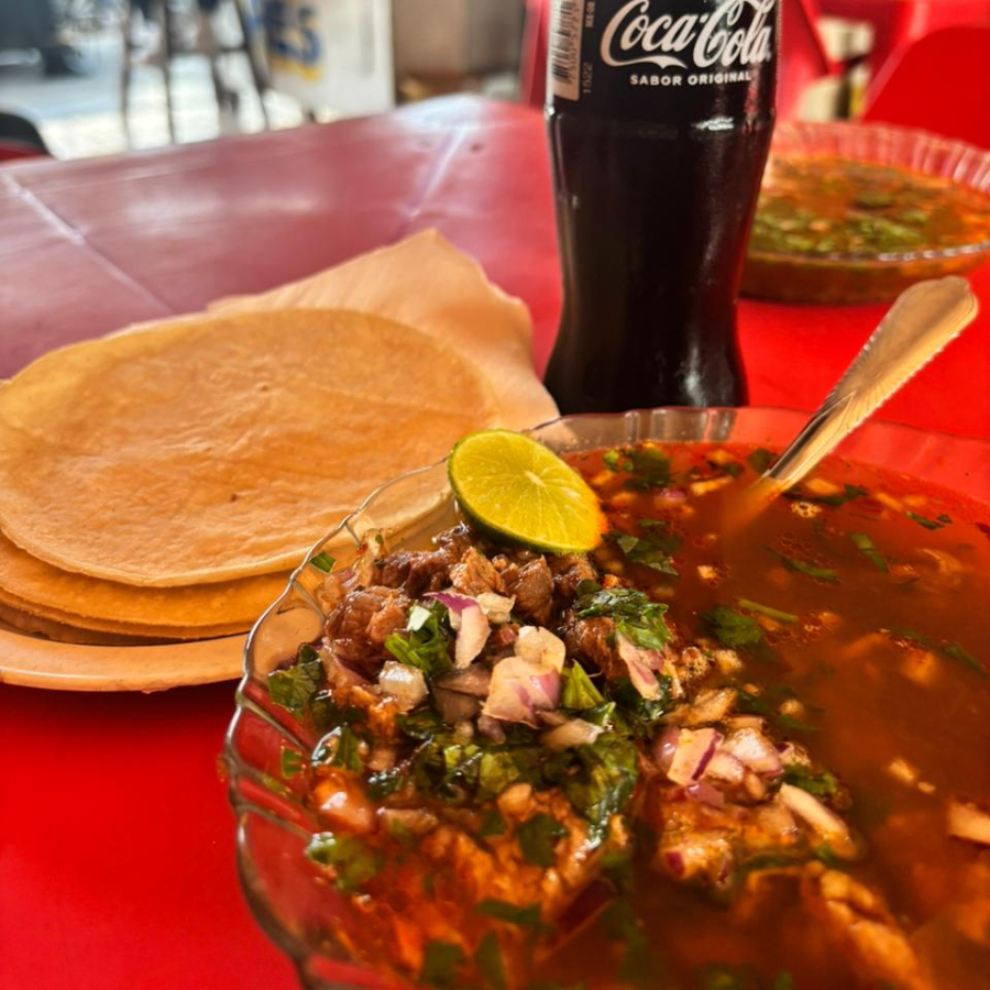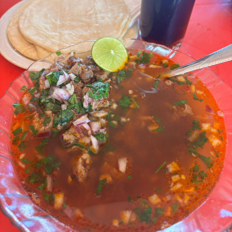 Orden de birria, con verduras aparte (cebolla, cilantro y limón)